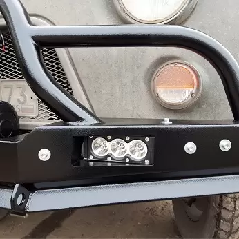 Так же силовой бампер оснащен мощными упорами под домкрат и буксирными проушинами, площадкой для установки лебедки и защитой основного и дополнительного света.