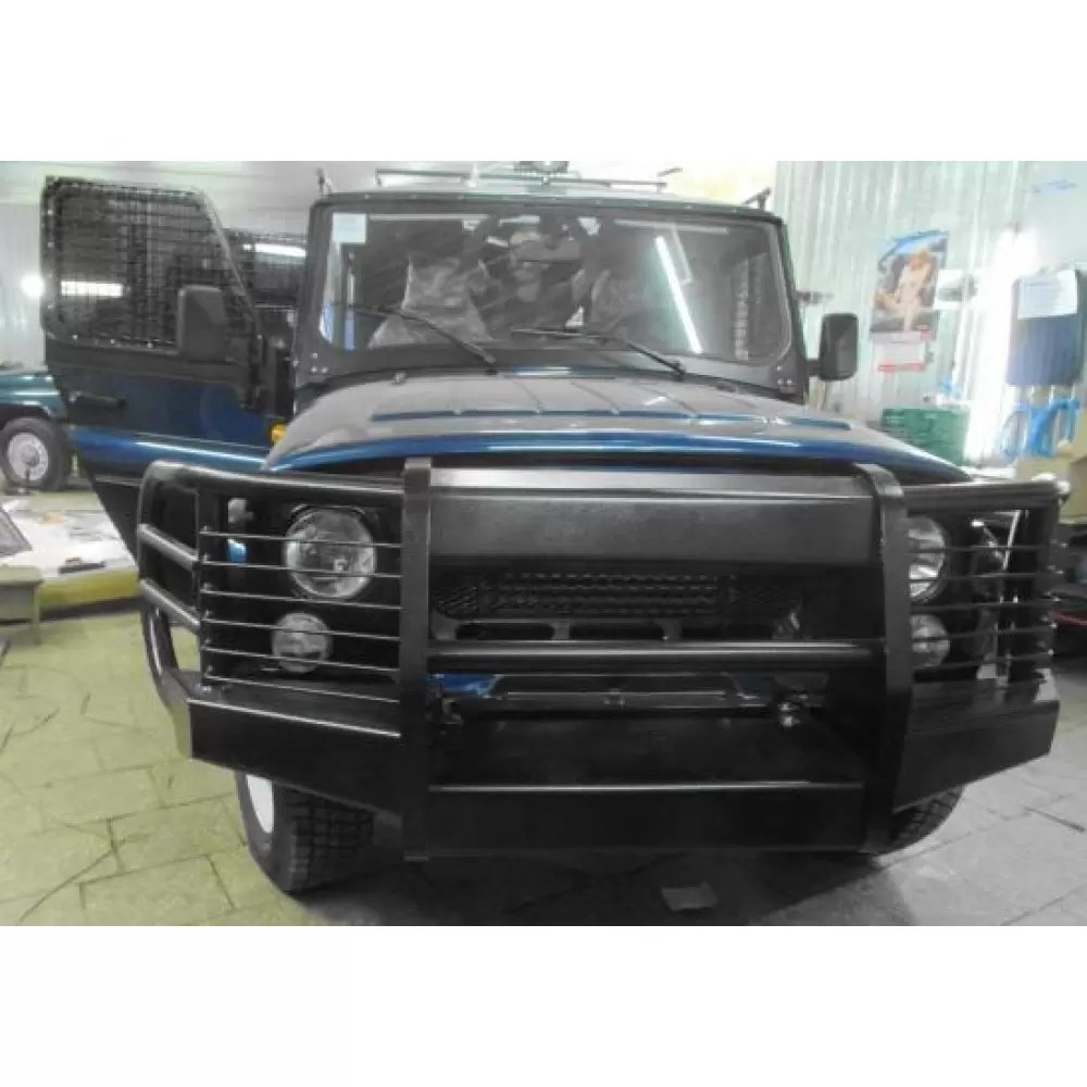 На этой странице можно купить Силовой передний бампер на УАЗ 469, Хантер "Шершень" (с площадкой и защитой фар)