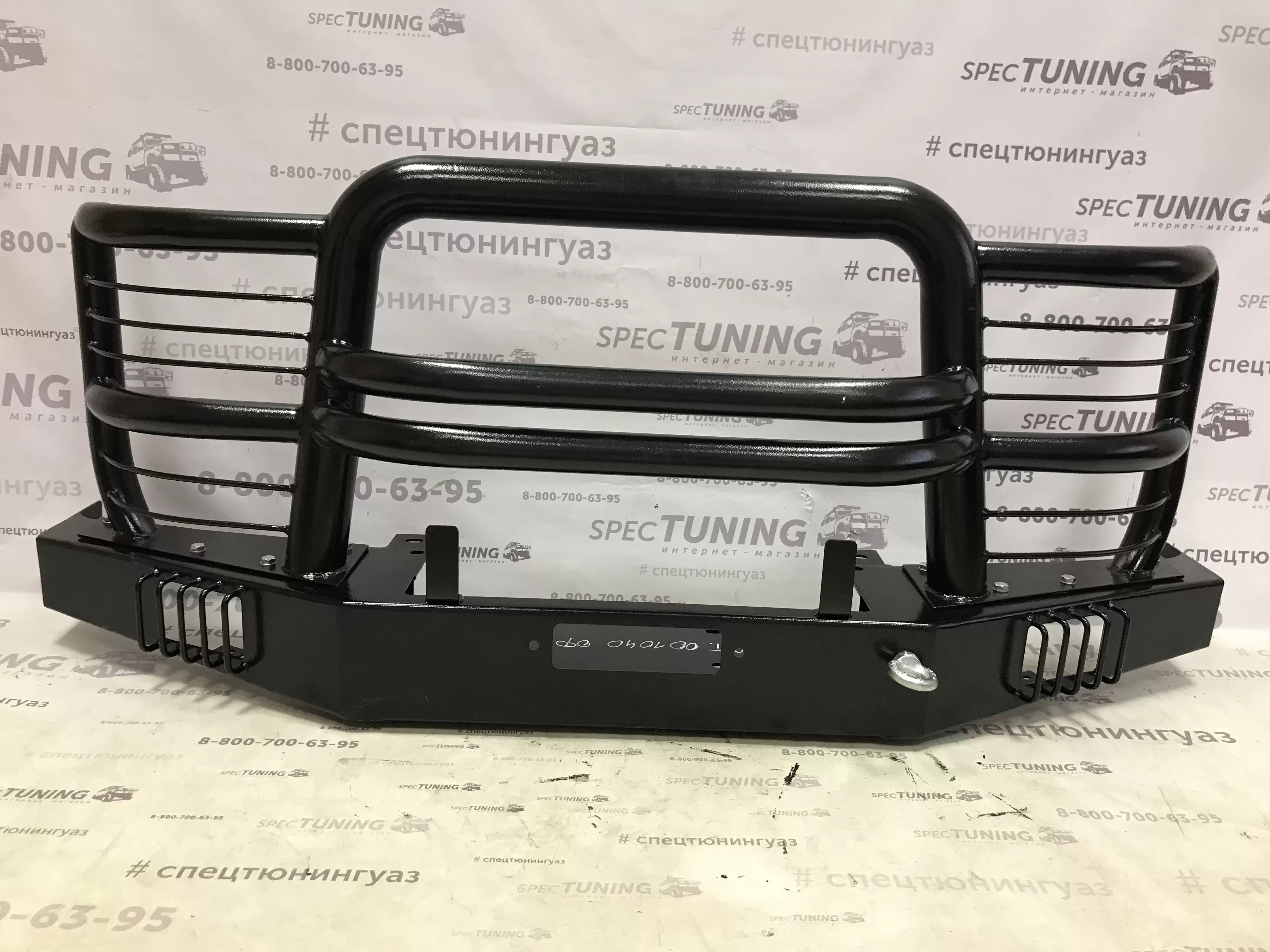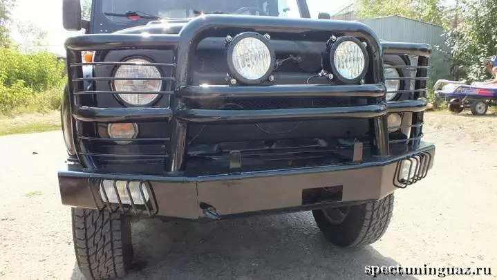 Так же силовой бампер оснащен мощными упорами под домкрат и буксирными проушинами, площадкой для установки лебедки и защитой основного и дополнительного света.