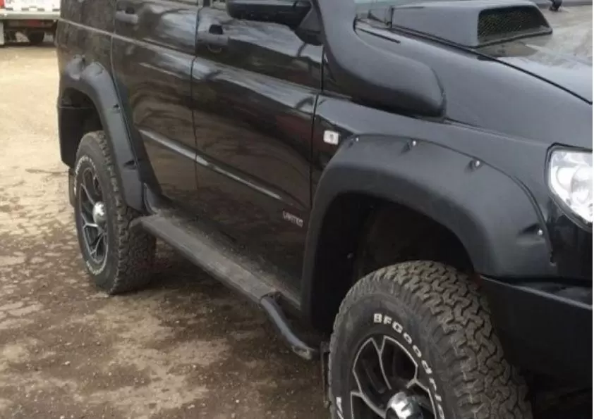 Расширители колёсных арок на кузов УАЗ 3163 Патриот Комплект из 4 х позиций исключающий накладки на бампер + комплект для монтажа. С возможностью установки колёс до 32" Материал LLDPE (эластон),фактура внешнего тиснения "песок".