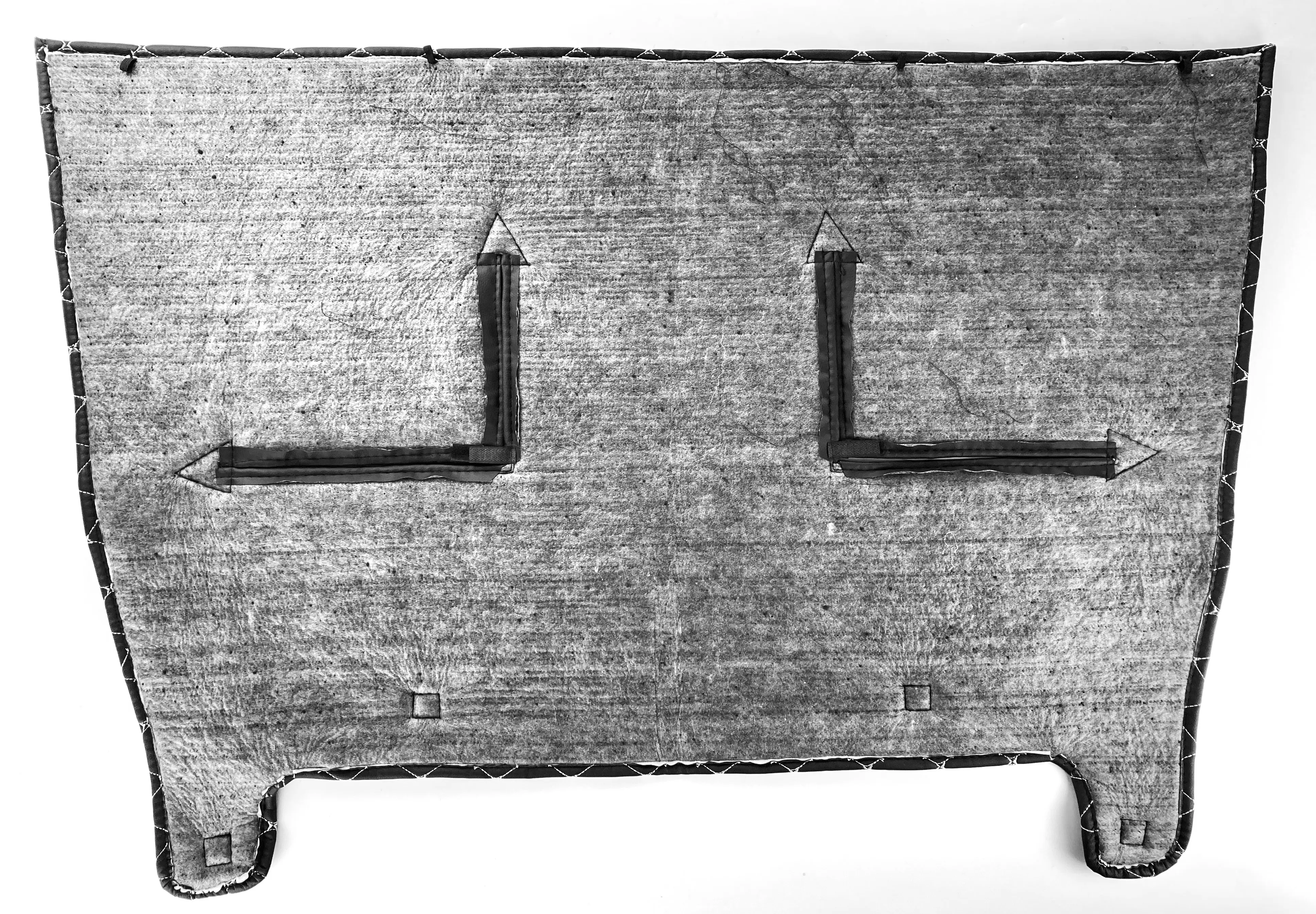 Изделие выполнено из винилискожи с декоративной прострочкой «чёрный ромб», внутри используется утеплитель (ватин). Материалы устойчивы к влаге, дорожной грязи и перепадам температур. Утеплитель плотно перекрывает поток холодного воздуха, помогая поддерживать рабочую температуру двигателя при движении.