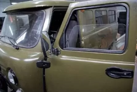 Сплошные стекла двери кабины с электростеклоподъемником, с возможностью вывода кнопки управления на ручку открывания двери для автомобилей УАЗ, моделей 3303, 3909, 3741, 39625, 3909, 2206 и их модификаций.