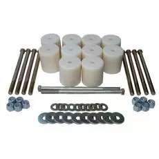Комплект Рама-Кузов используется для лифтинга кузова. Изготавливается из полимера диаметром 60мм в размерах 30мм, 40мм, 50мм, 60мм, 70мм, 80мм, 90мм, 100мм. Комплектуется высокопрочным крепежом, в зависимости от модели автомобиля. Устанавливается между кузовом и подушкой крепления кузова к раме. При установке используется крепеж большего диаметра, поэтому требуется рассверлить отверстия в кузове, изготовленные под болт с квадратным подголовком до диаметра 12,5мм.