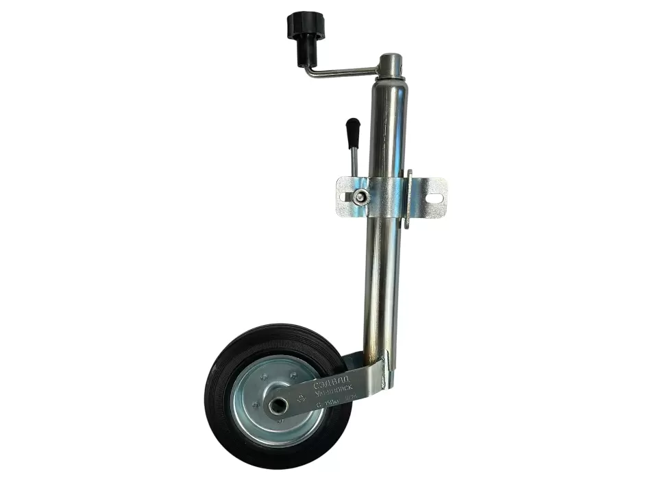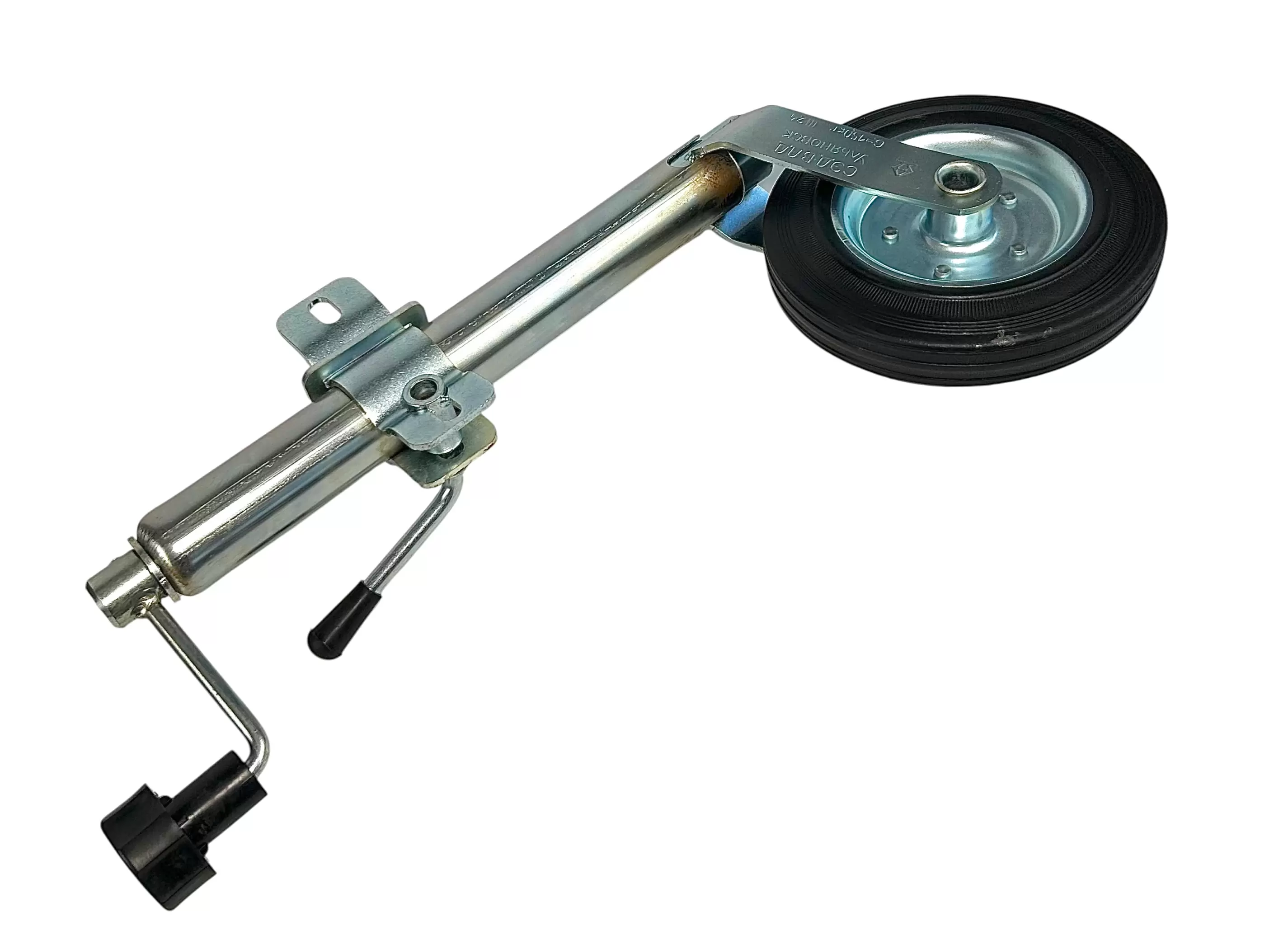 Опорное колесо для прицепа, или подкатное - приспособление для повышения маневренности и повышения устойчивости данного агрегата. По сути, принцип работы основан на домкратном механизме, нижняя часть которого оснащена колесом. Фиксируется на дышле, обжимаясь хомутом или привариваясь хомутом.