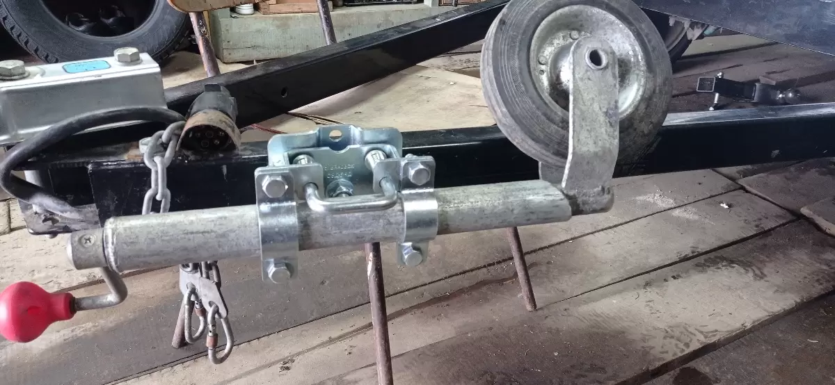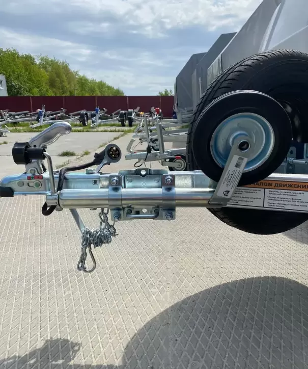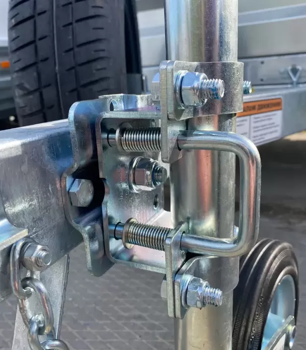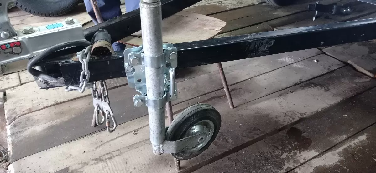 Поворотный хомут опорного колеса позволяет транспортировать прицеп не снимая колесо. С помощью поворотного механизма колесо становится в горизонтальное положение, вдоль дышла.Теперь не нужно каждый раз снимать и надевать опорное колесо на прицеп.