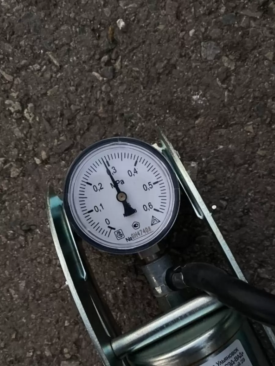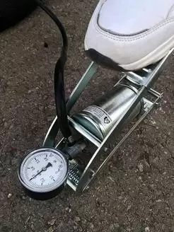 - Равномерно нажимая ногой на педаль, накачать шину до необходимого давления (не более 4 кгс/см2), отсоединить шланг от вентиля камеры и привести его в транспортное положение.