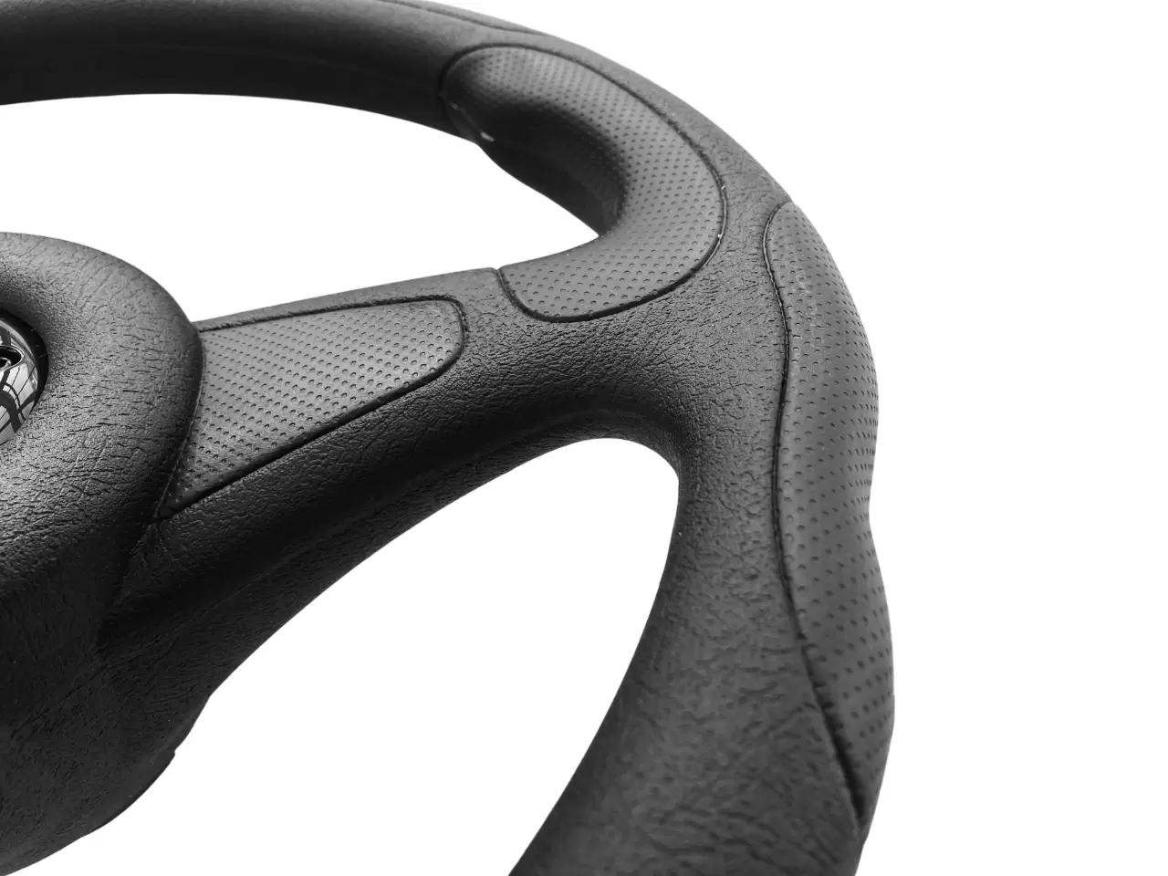 Спортивный трехспицевый руль со срезанным низом. Срез снизу даёт больший простор при посадке водителя в автомобиль и ощутимо увеличивает место в салоне.