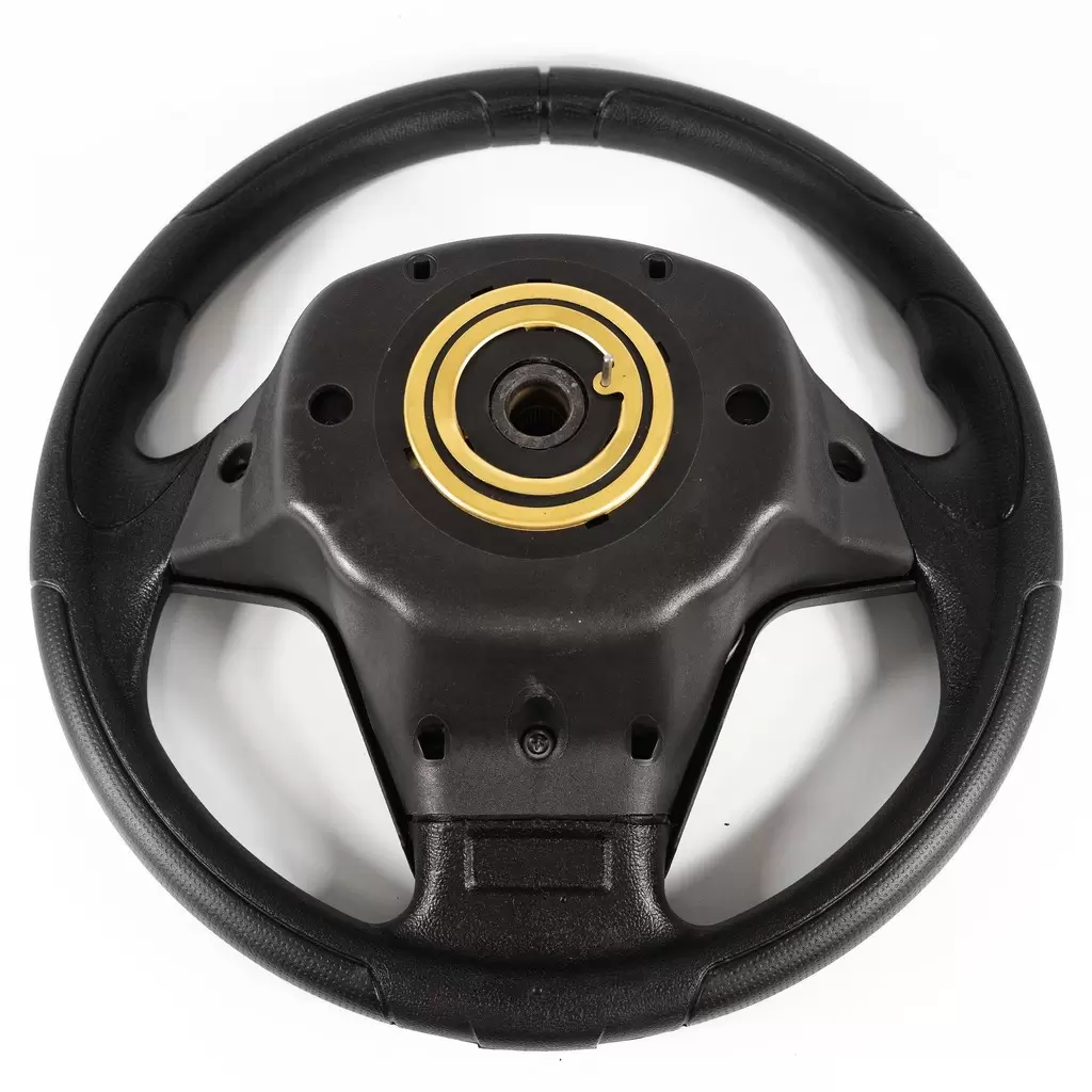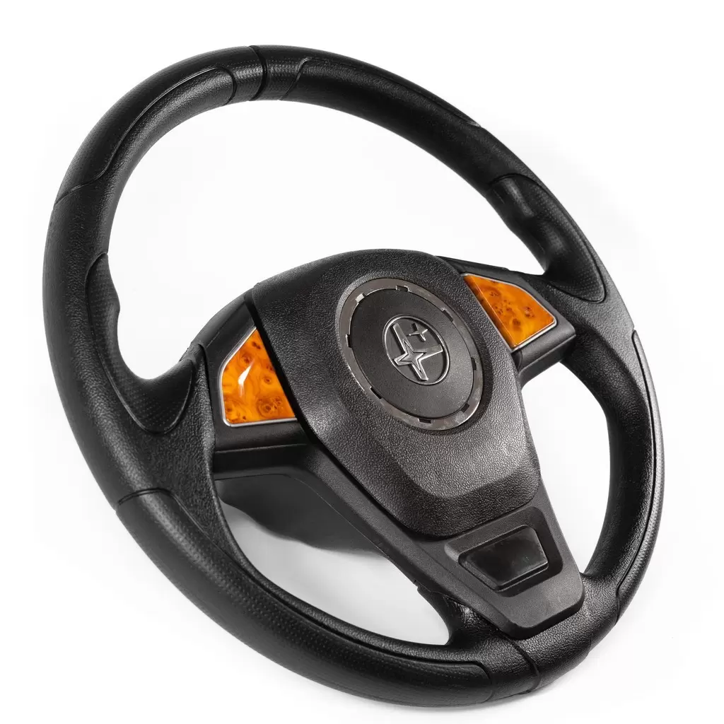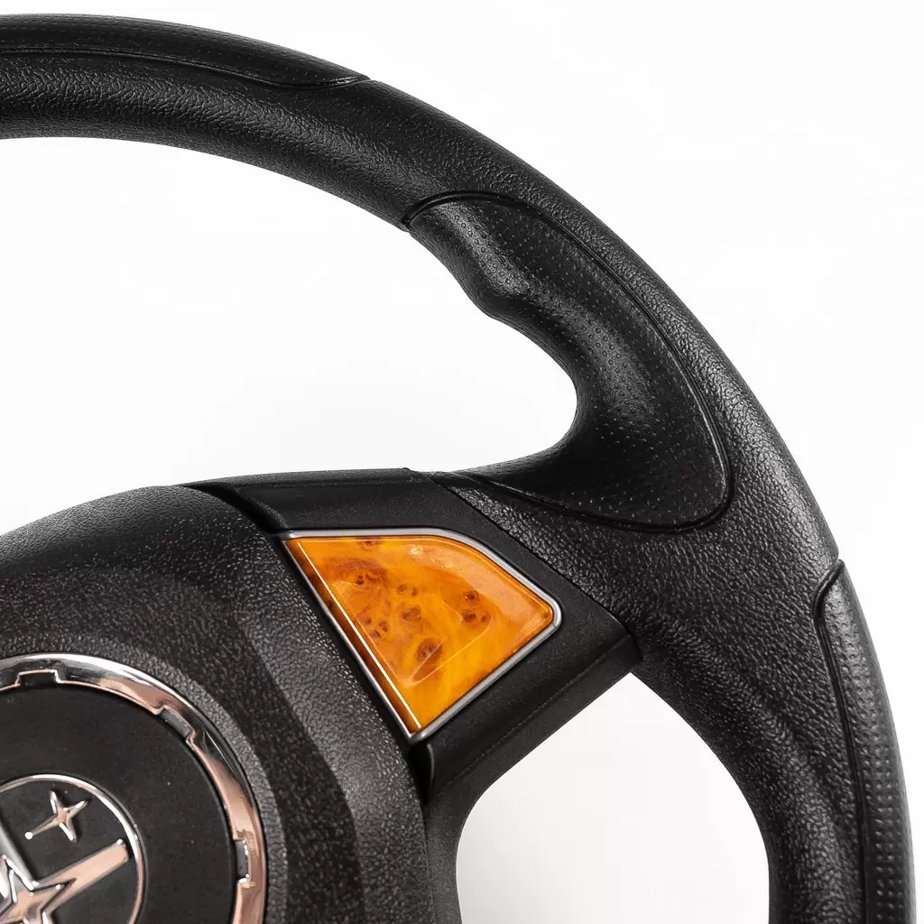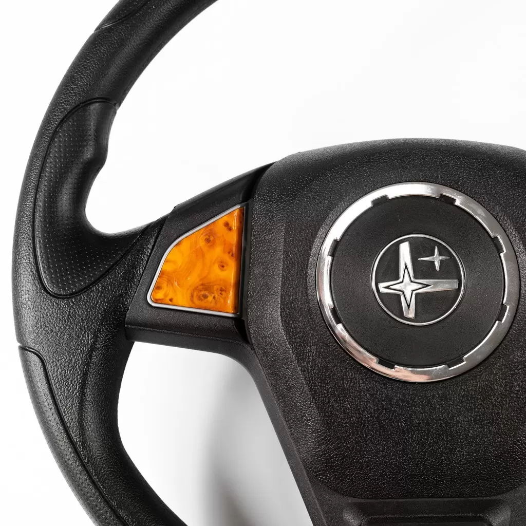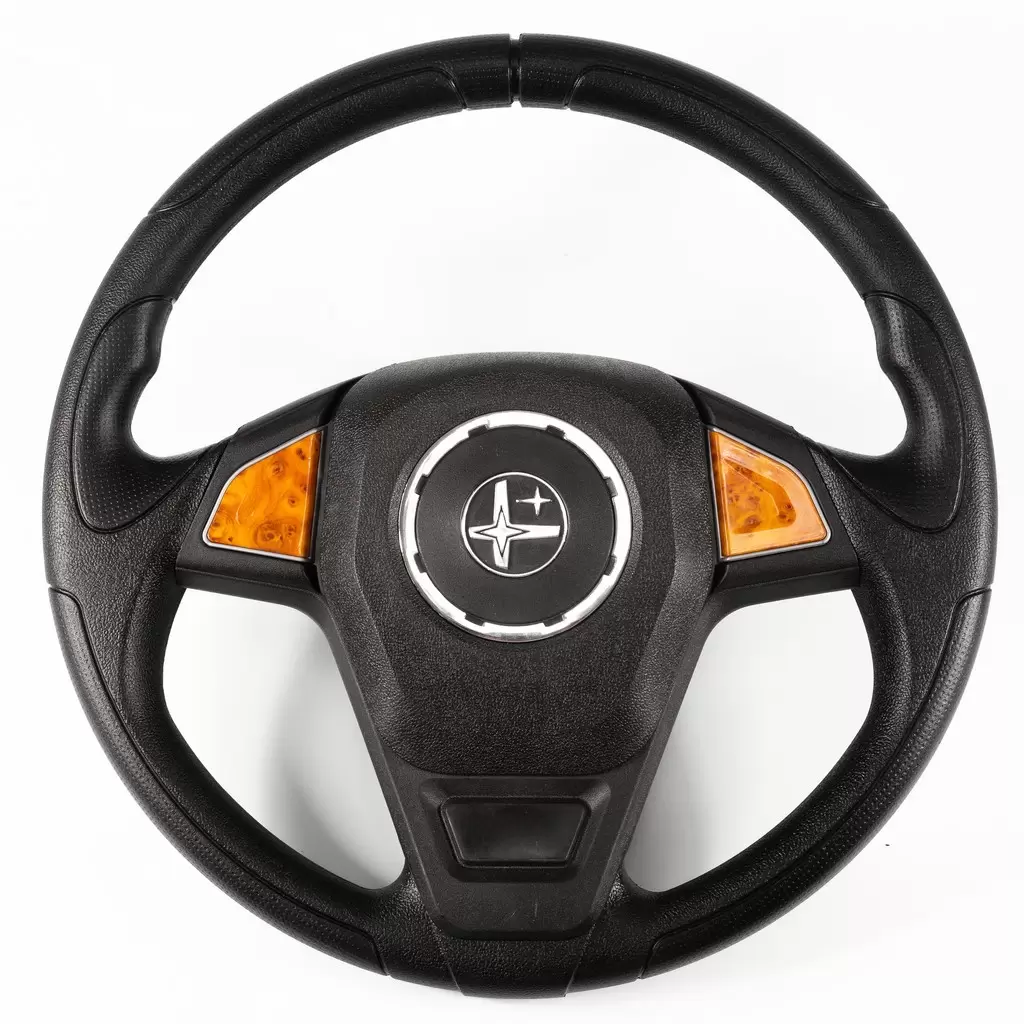 Удобный и стильный трехспицевый руль. Рельефный обод обеспечивает удобный хват и лучшую управляемость. В центре размещен логотип производителя (стилизованная полярная звезда), обрамленный хромированным либо черным кольцом (в зависимости от варианта исполнения).