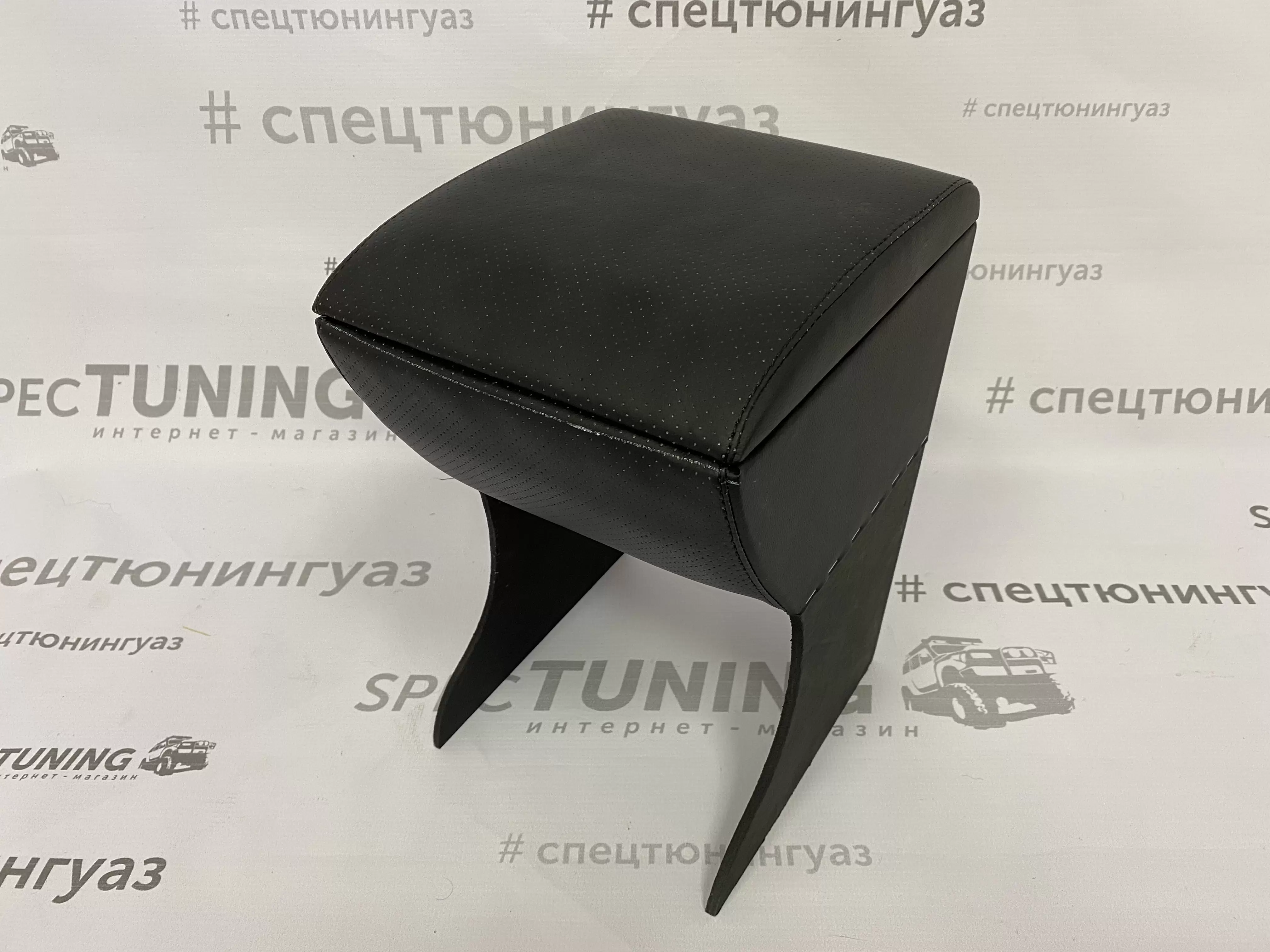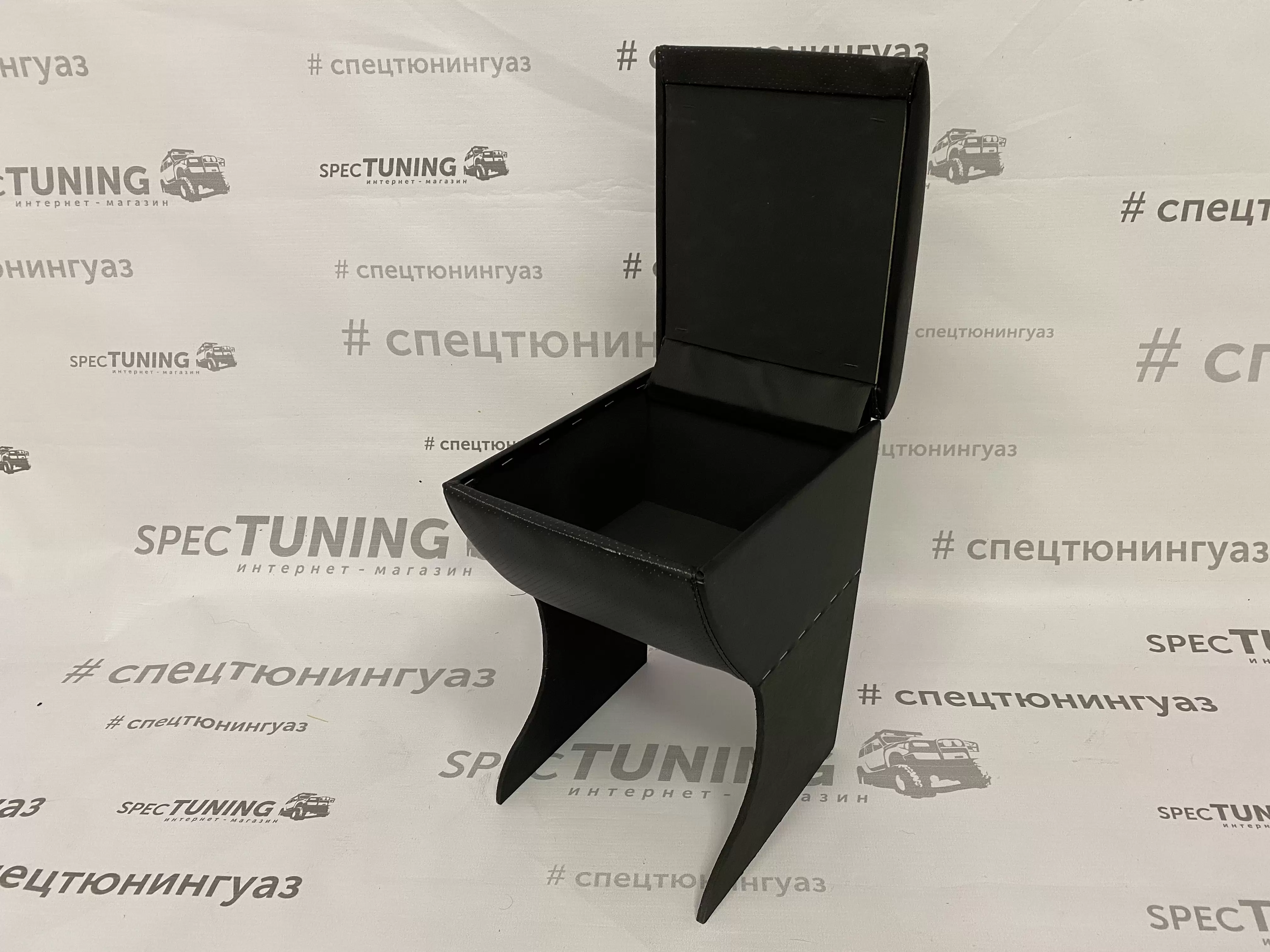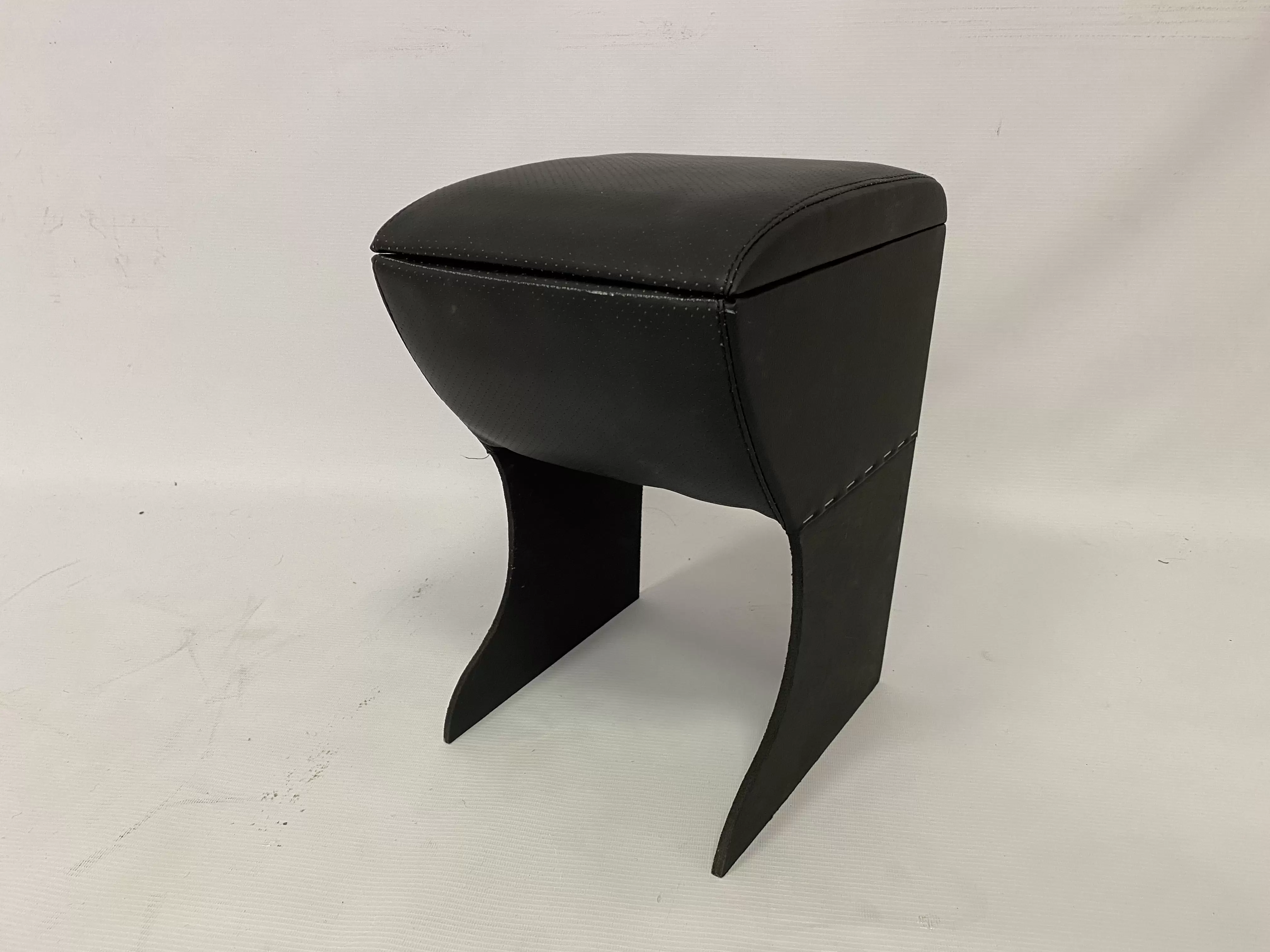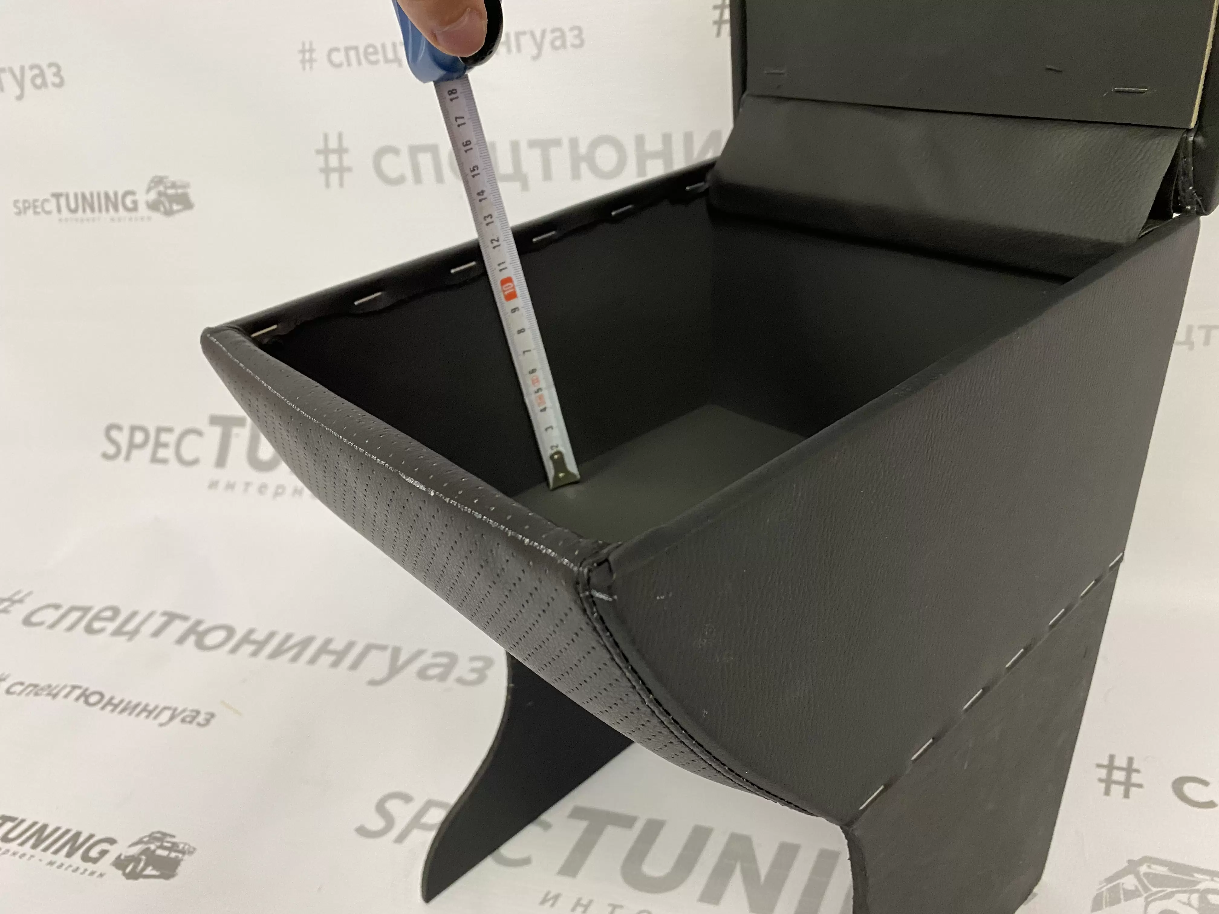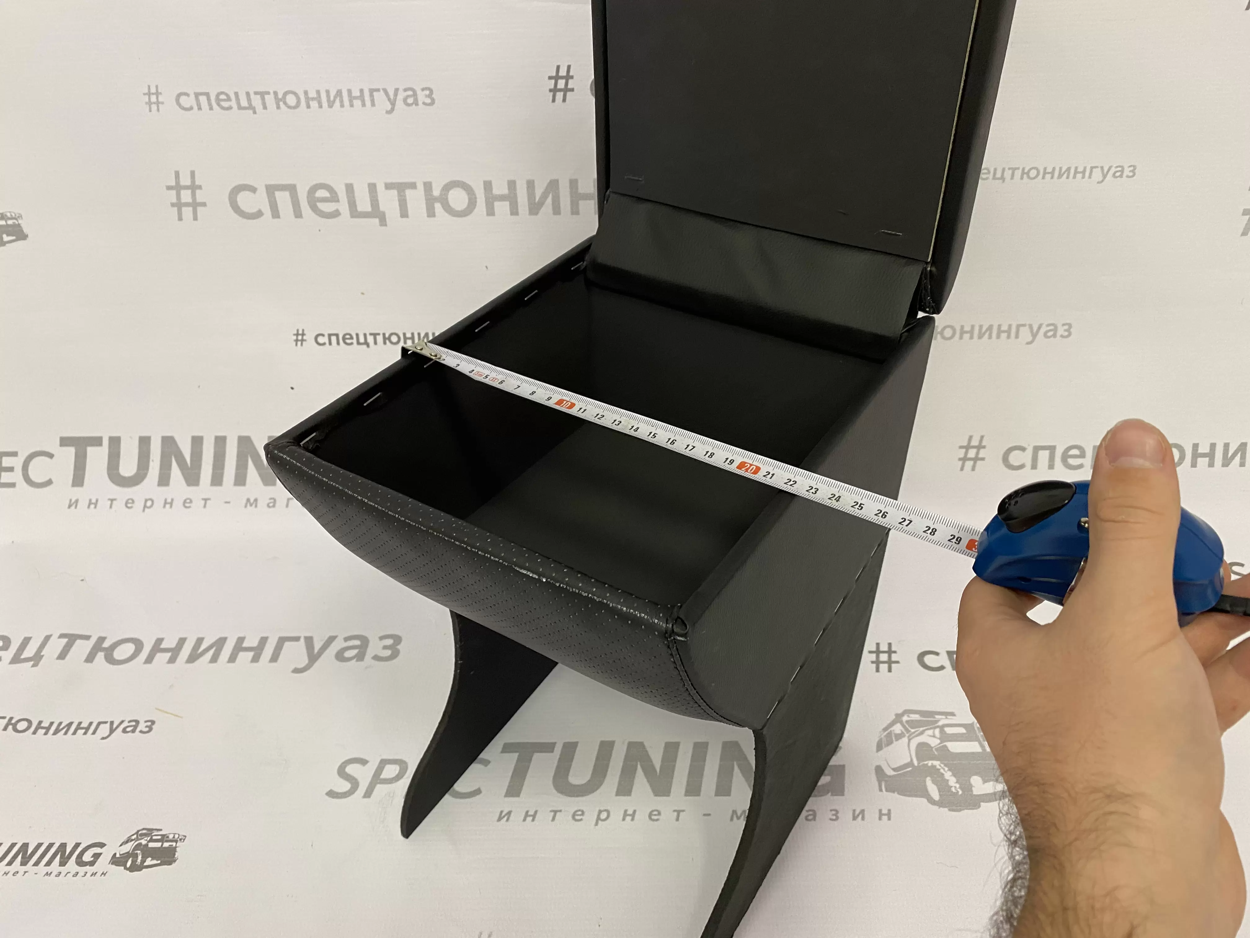 Корпус подлокотника выполнен из фанеры и обтянут экокожей. Внутреннее пространство ящика дополнительно обтянуто карпетом, что повышает аккуратность и практичность использования.
