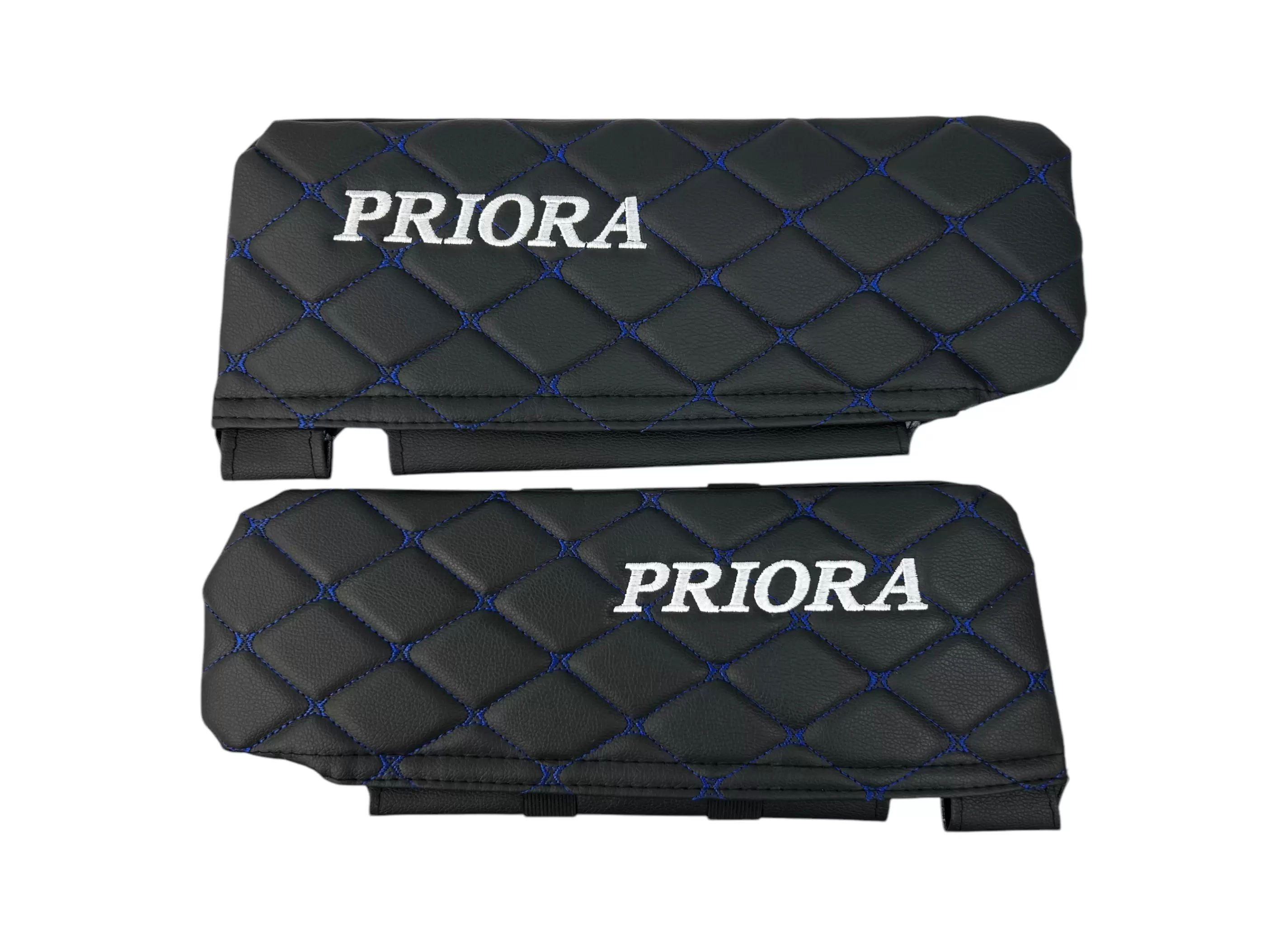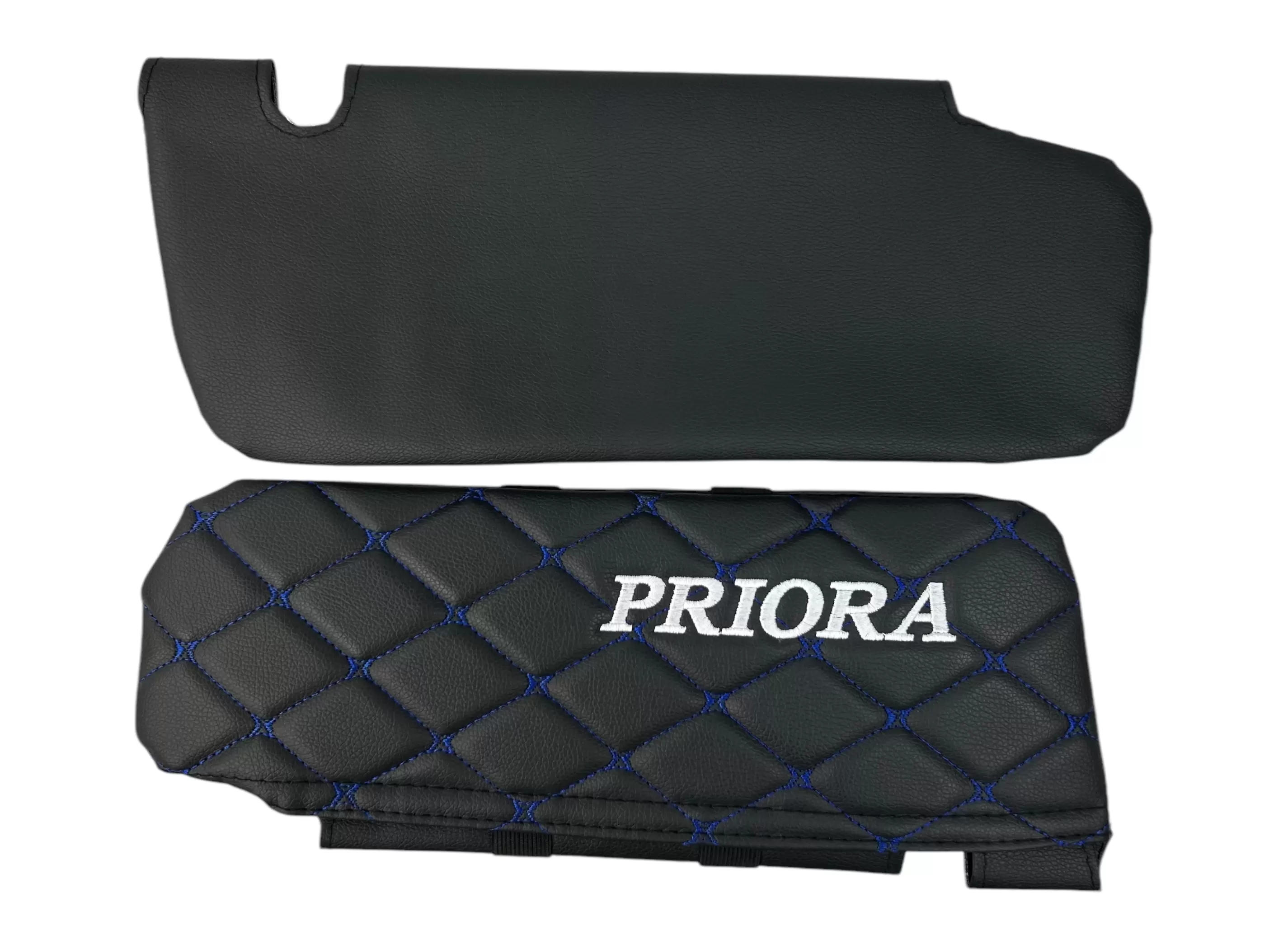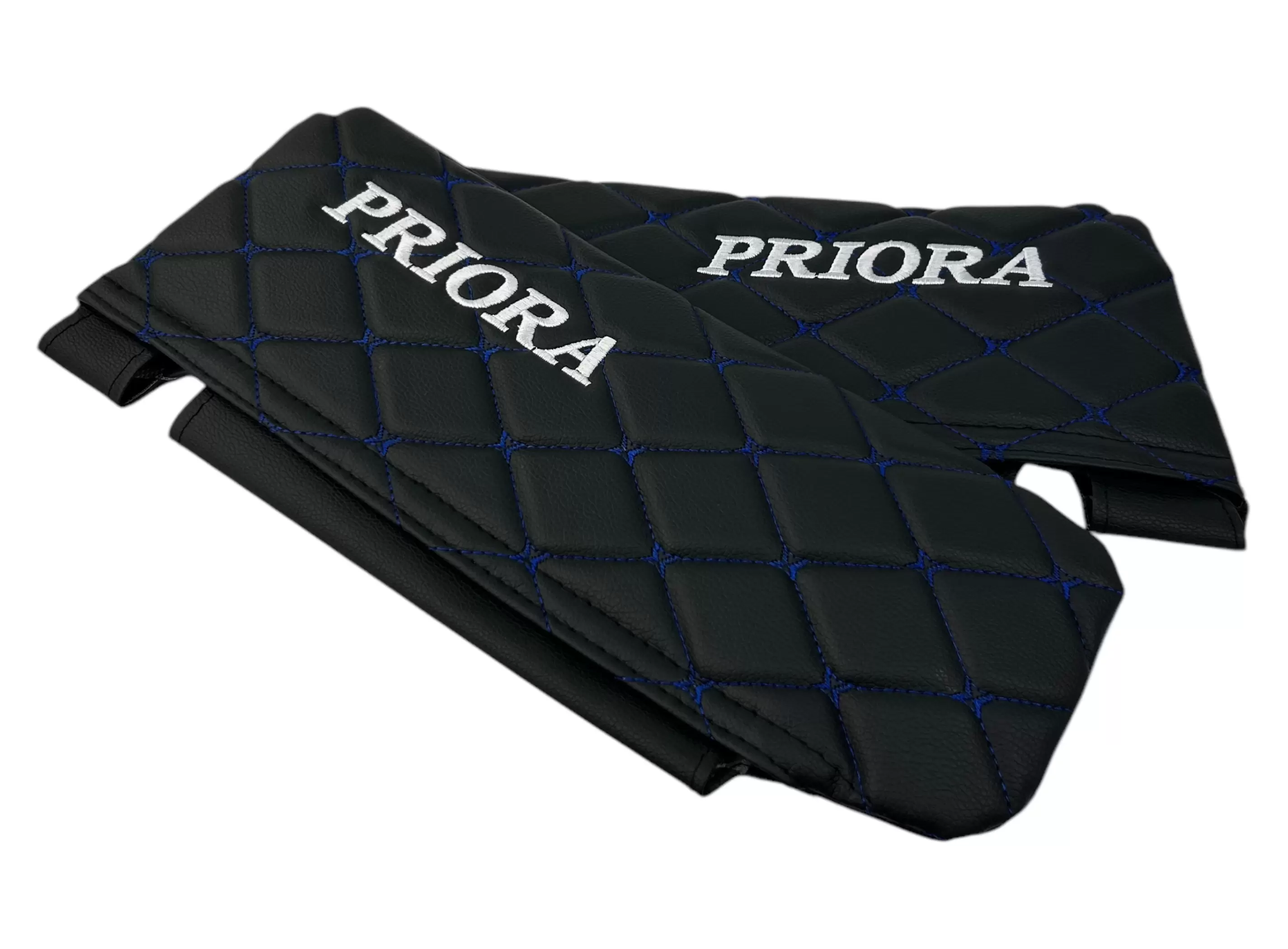 Чехлы на козырьки LADA Priora (Приора) с надписью, черный ромб синяя нить, комплект
