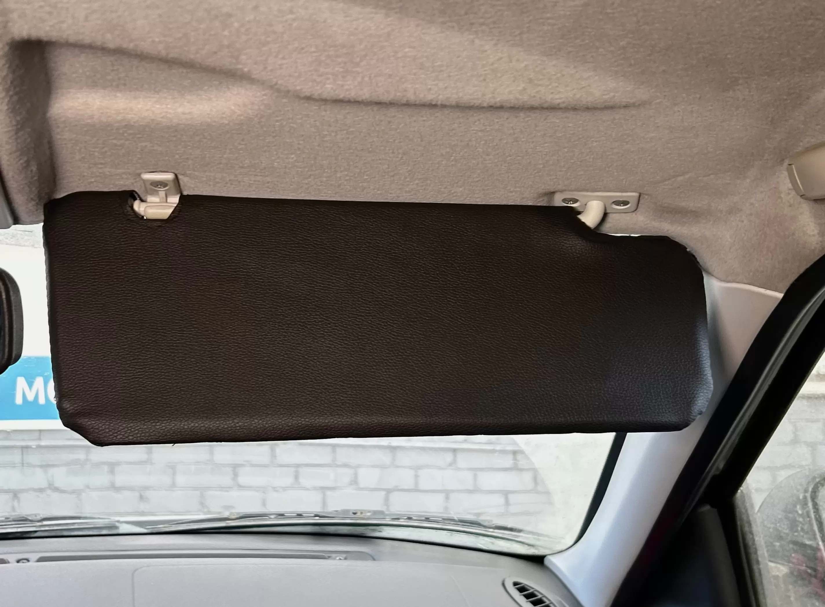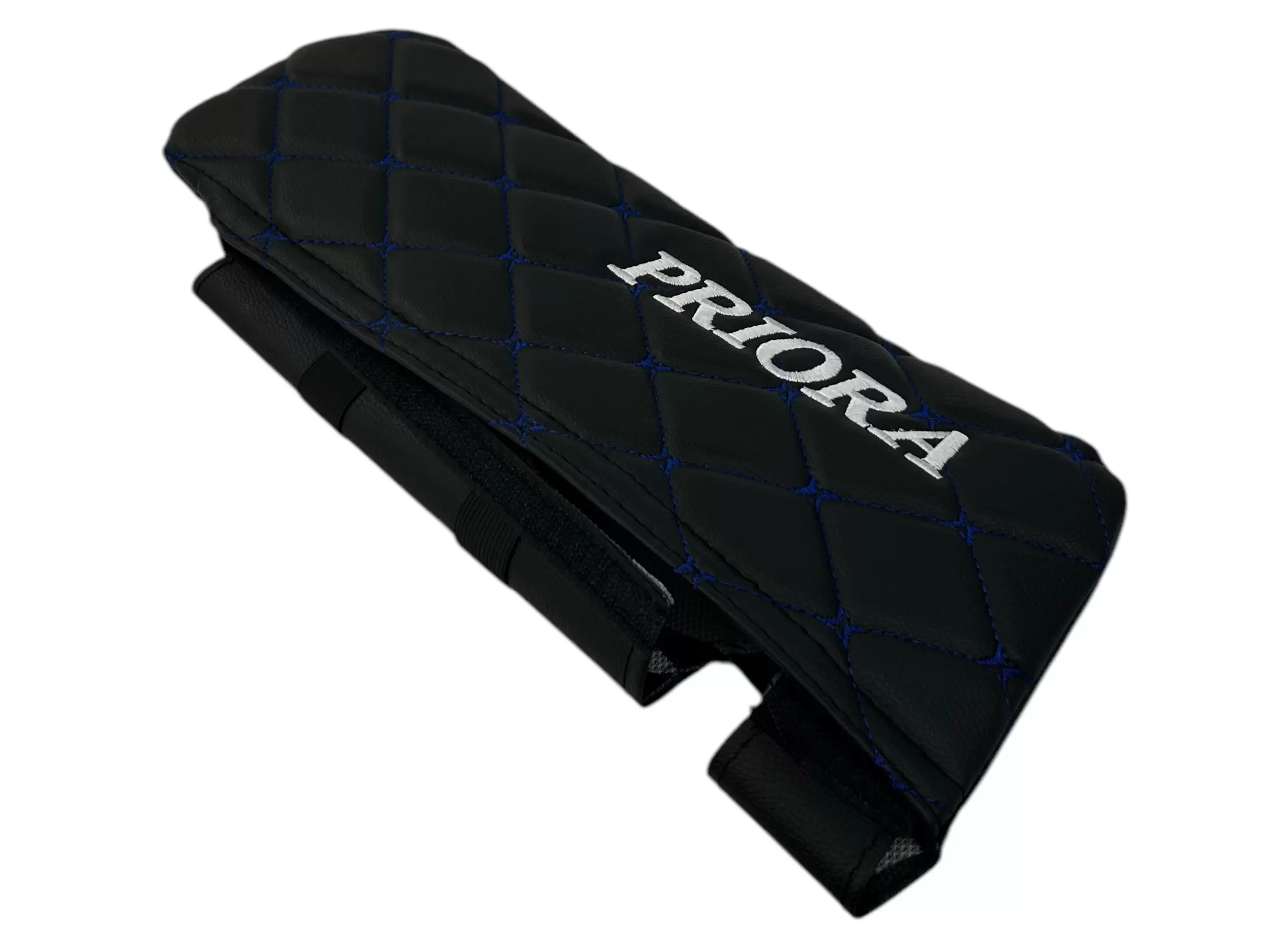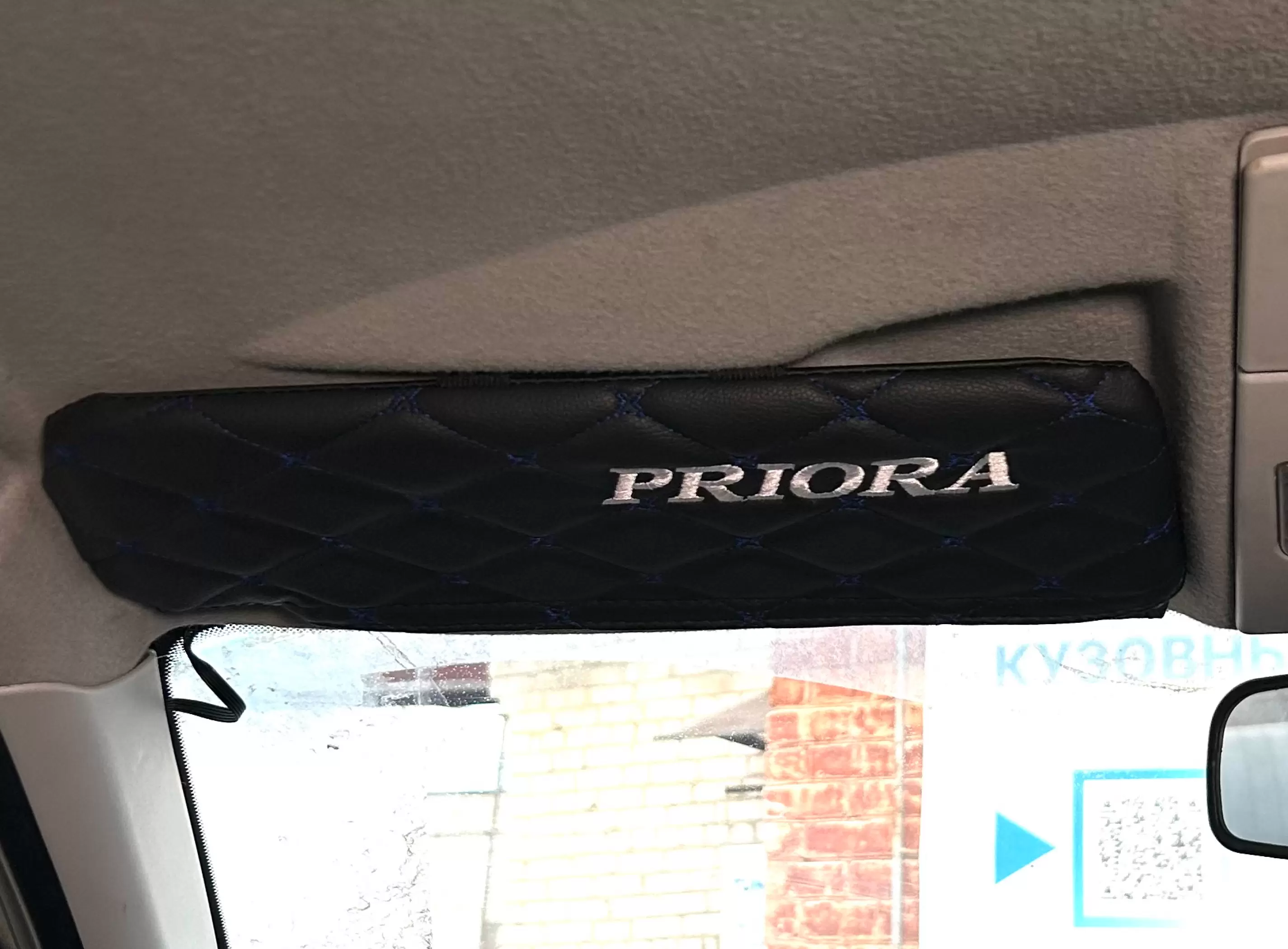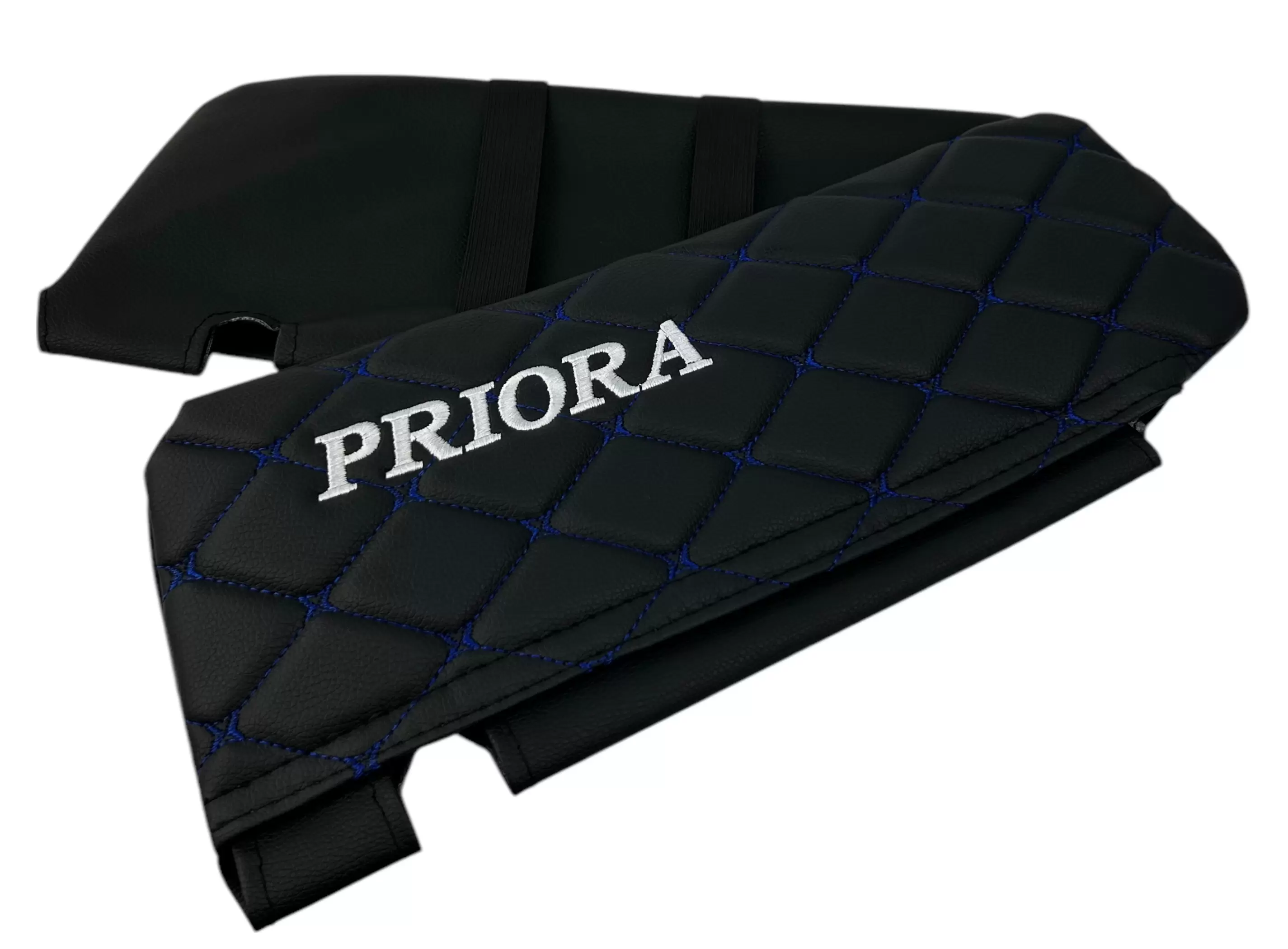 Чехлы на козырьки LADA Priora (Приора) с надписью, черный ромб синяя нить, комплект