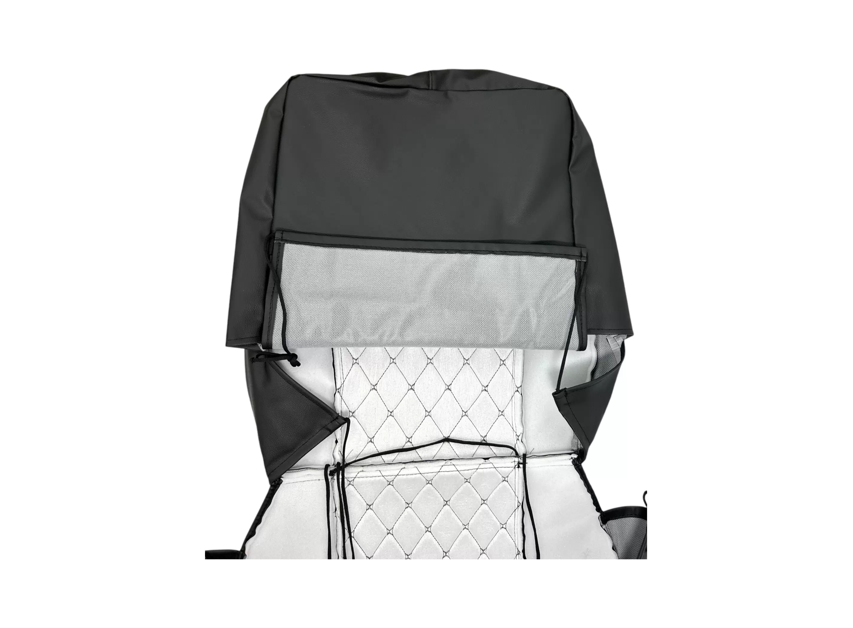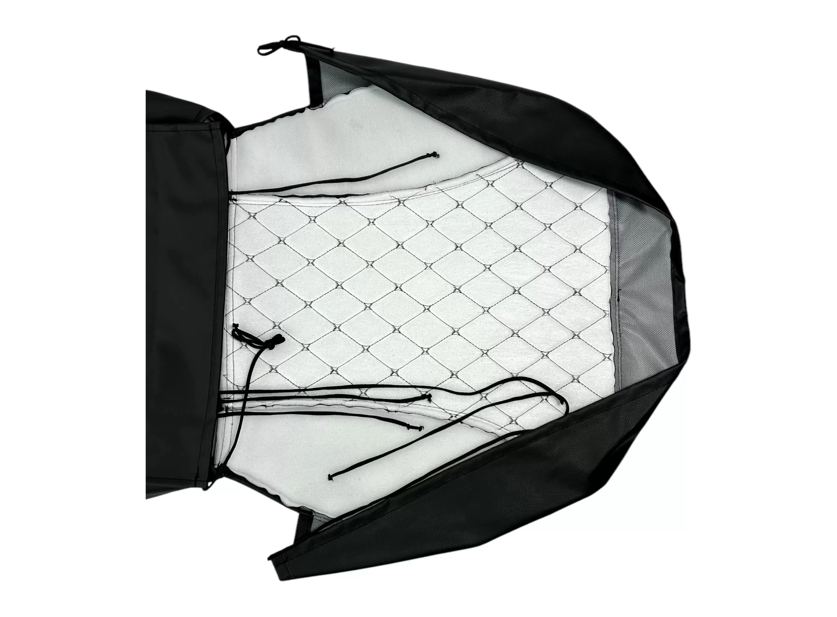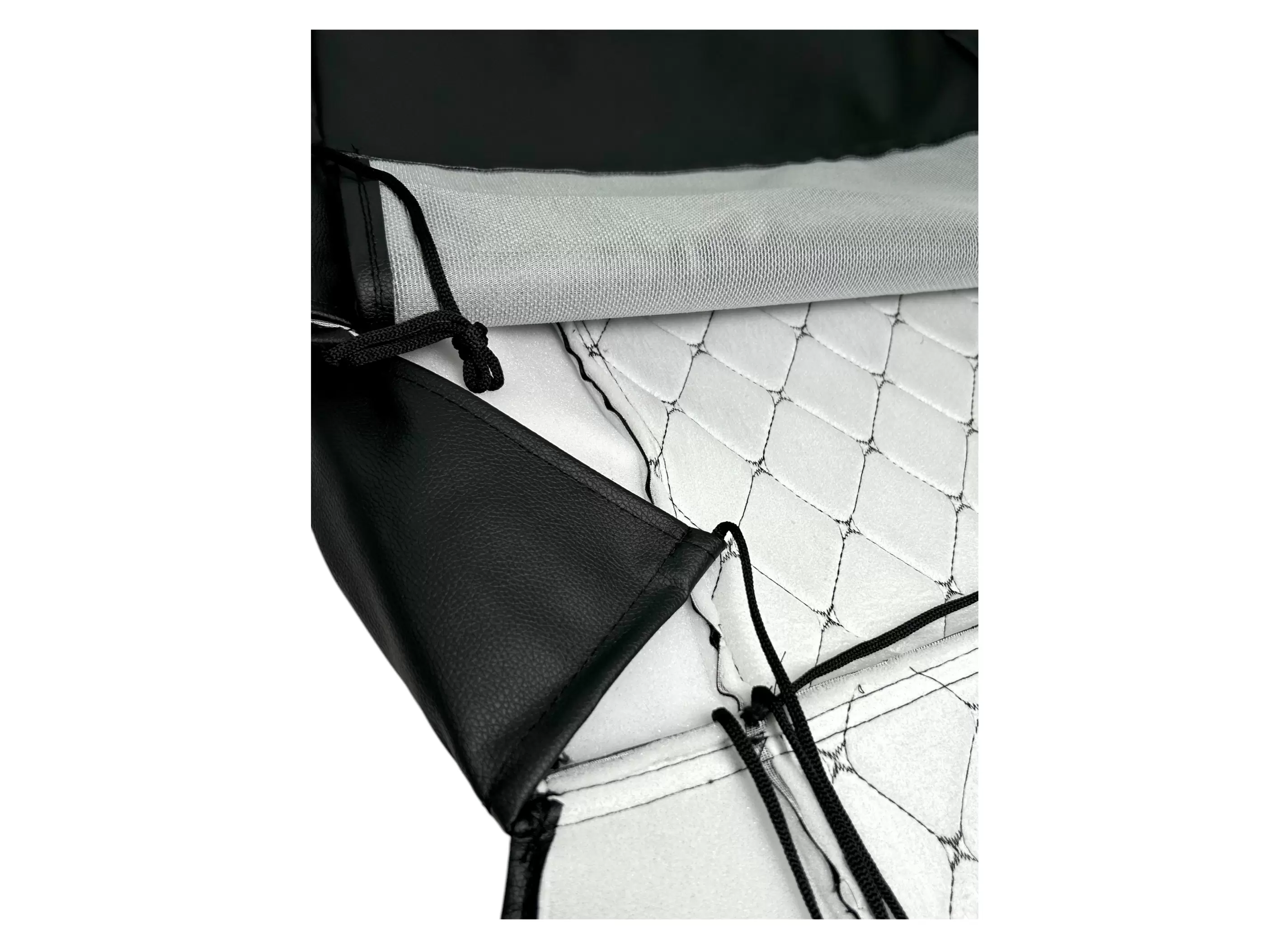 Изготовлен из прочной винилискожи с фактурой «чёрный ромб», что делает чехол одновременно износостойким, практичным в уходе и эстетичным. Внутренний слой включает поролон для повышения комфорта и спанбонд, который поддерживает форму и предотвращает деформацию наполнителя.
