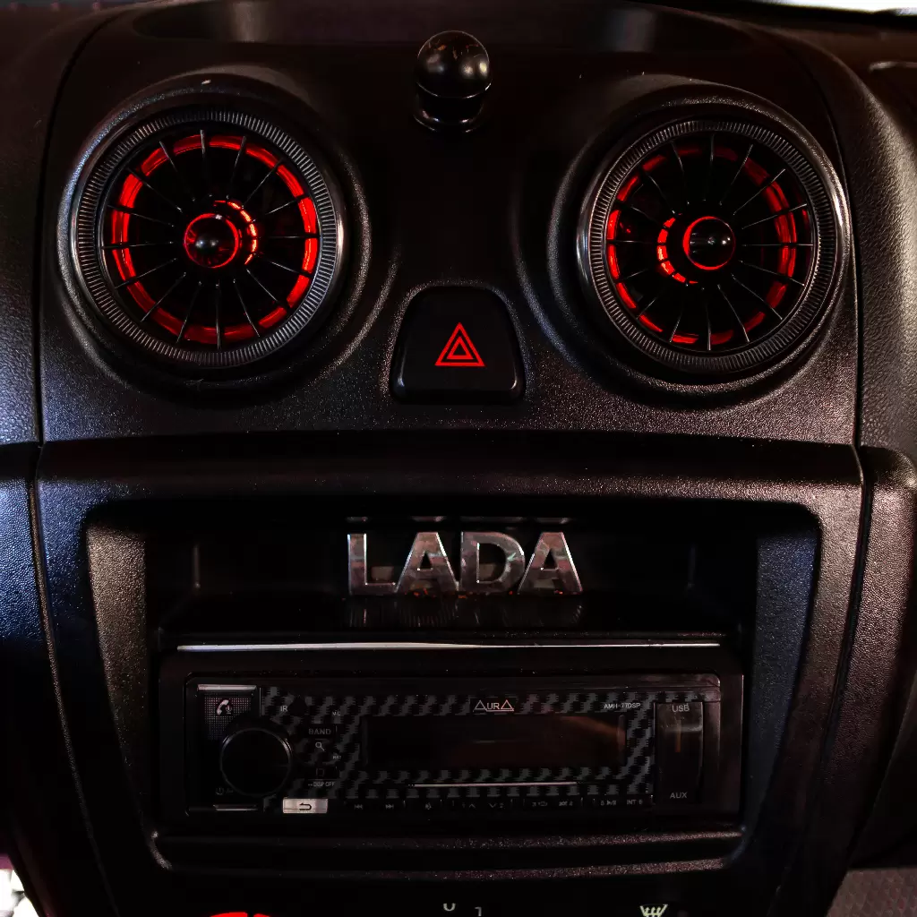 Декоративный дефлектор воздуховода с синим светодиодом выполнен в стиле AMG и предназначен для установки в панель приборов автомобилей LADA Granta и совместимых моделей. Изделие сочетает в себе функциональность штатного воздуховода и современный внешний вид, подчёркивающий индивидуальность интерьера салона.