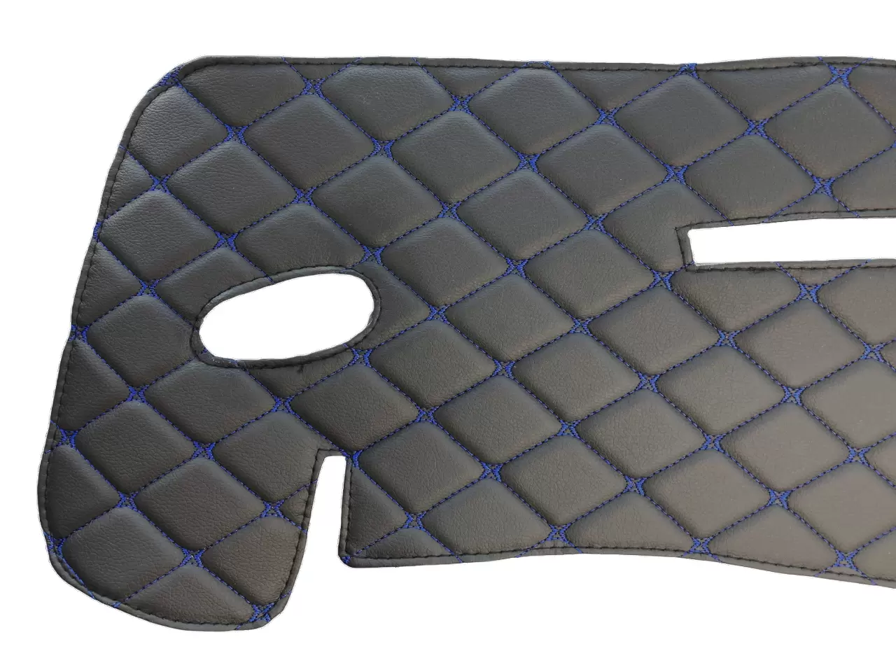Проработанный оригинальный дизайн накидки из декоративных черных ромбов, прошитых синей нитью, придаст салону Вашего автомобиля стильный, эстетичный и элегантный внешний вид.