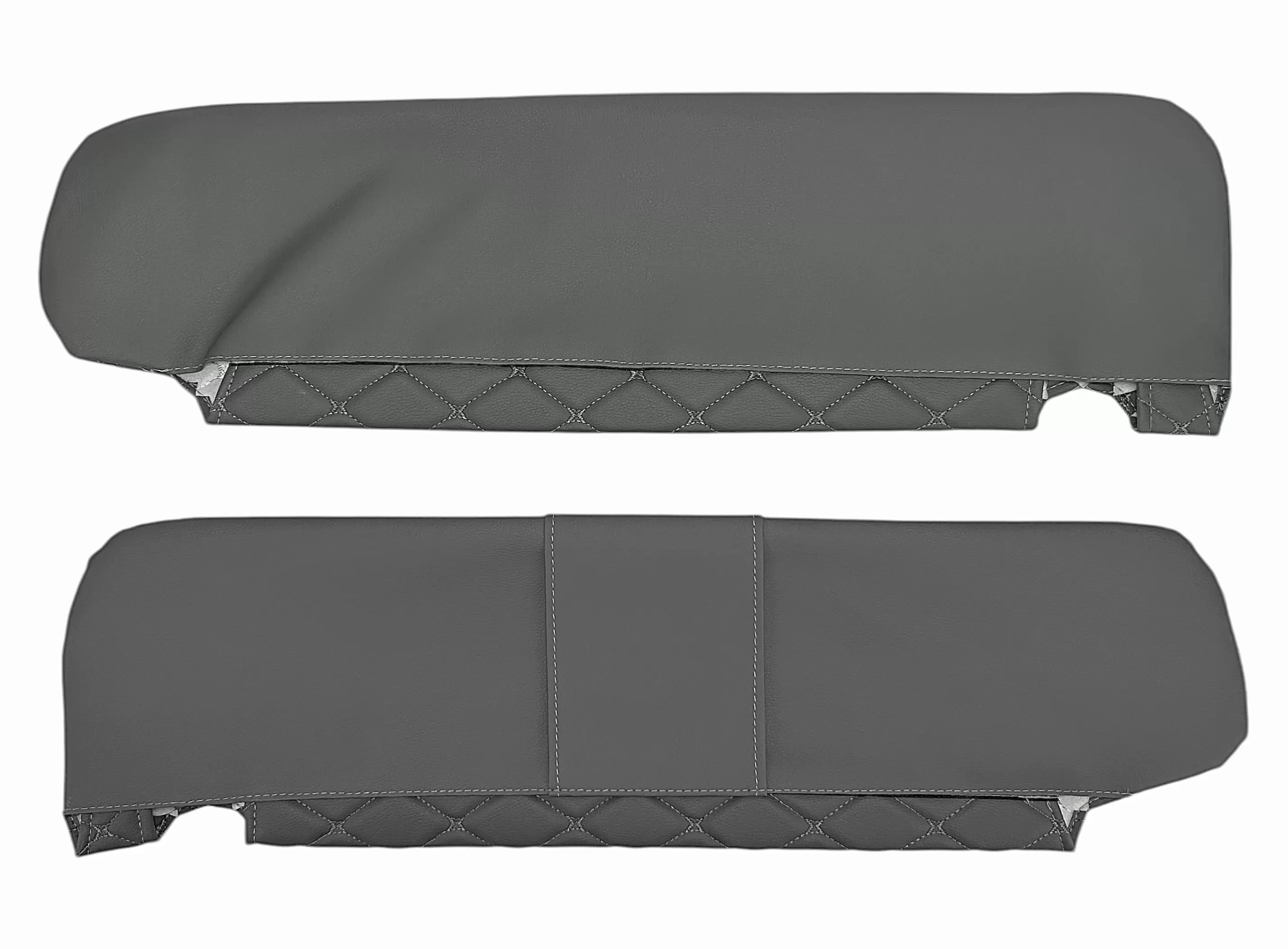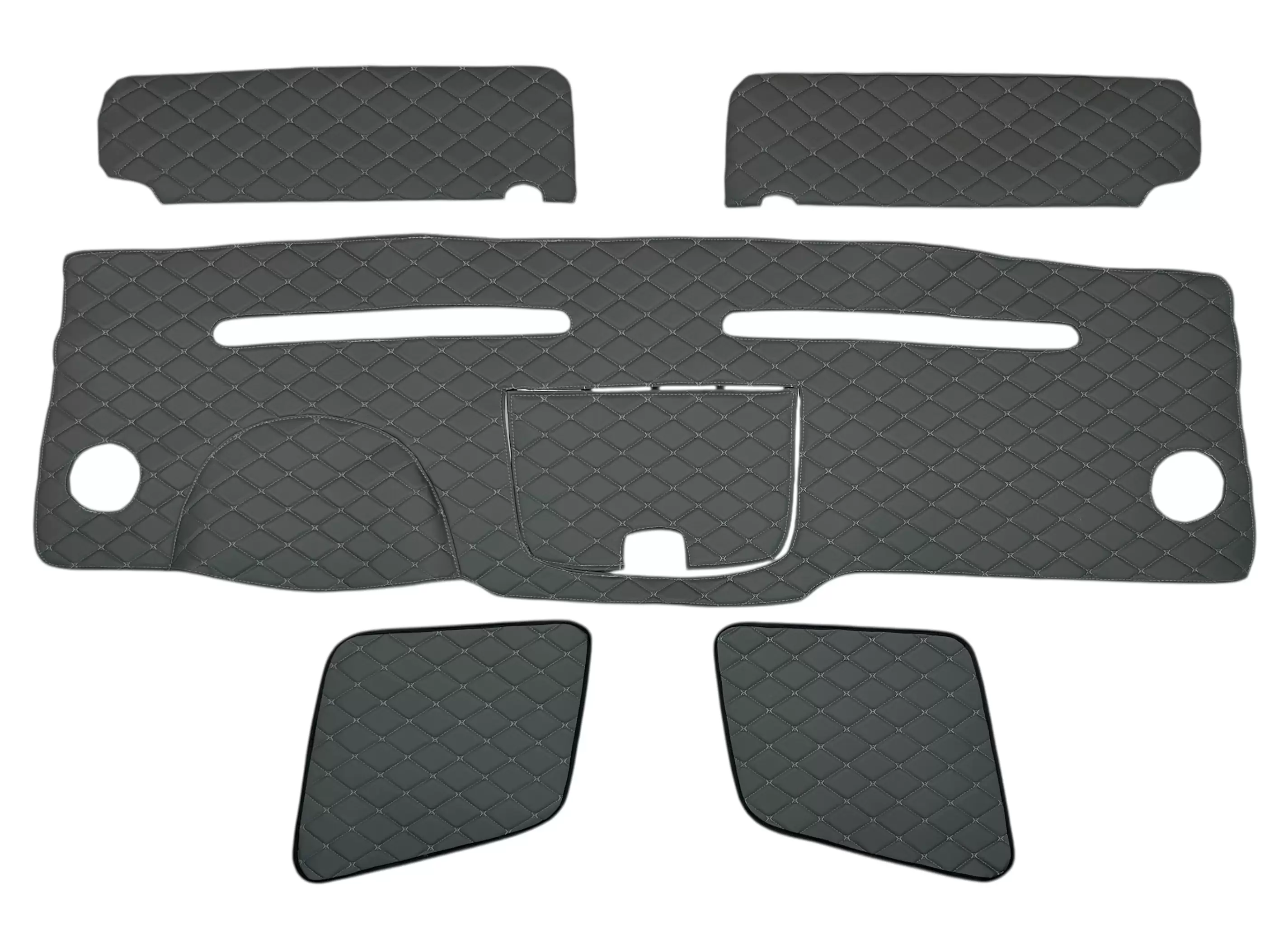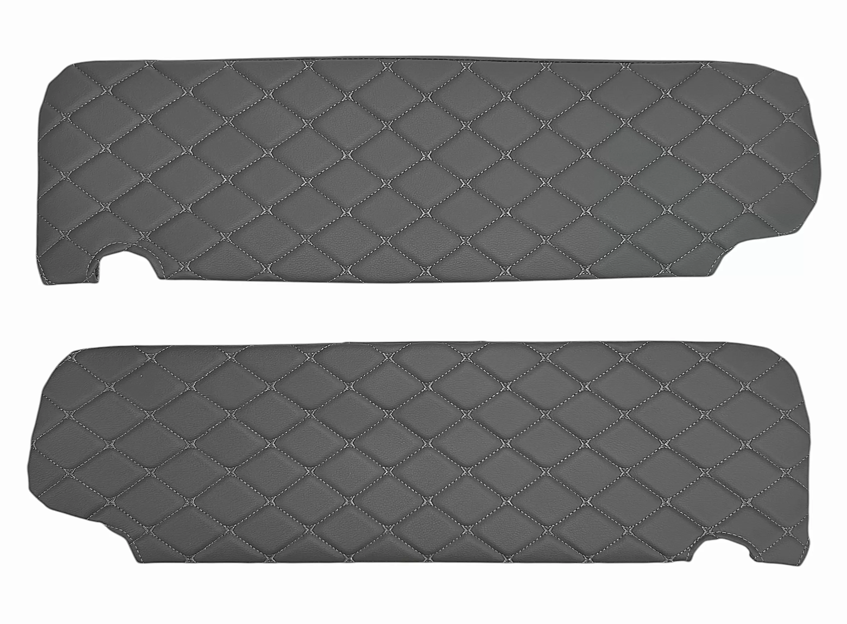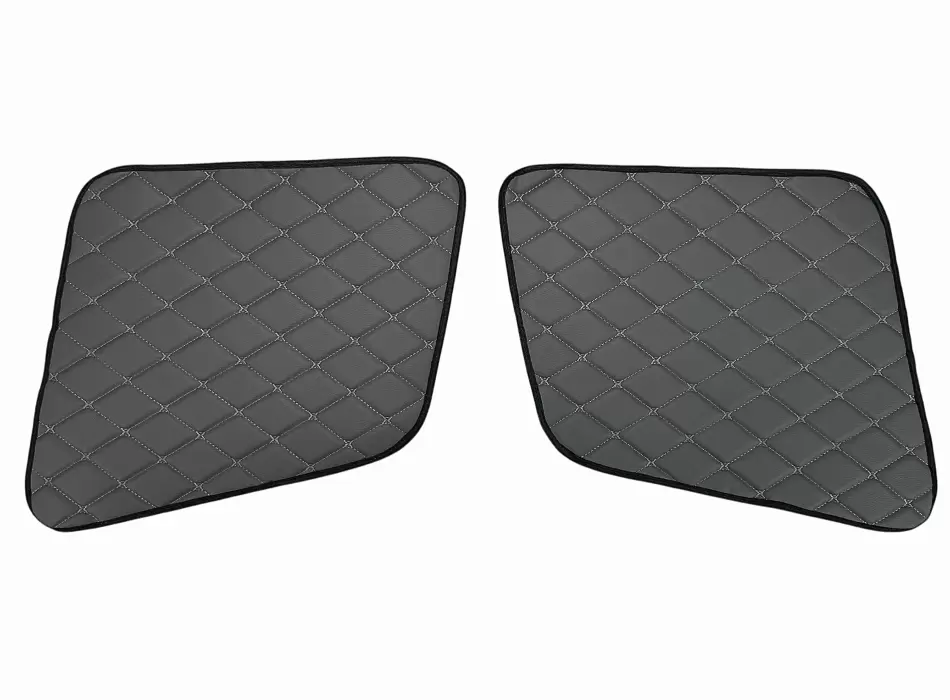 Все элементы комплекта изготовлены из винилискожи с декоративной ромбовидной прострочкой. Материал устойчив к истиранию, загрязнениям и легко очищается, что делает его практичным решением для коммерческого транспорта. Обивка доступна в различных цветовых решениях, что позволяет подобрать вариант под интерьер автомобиля.