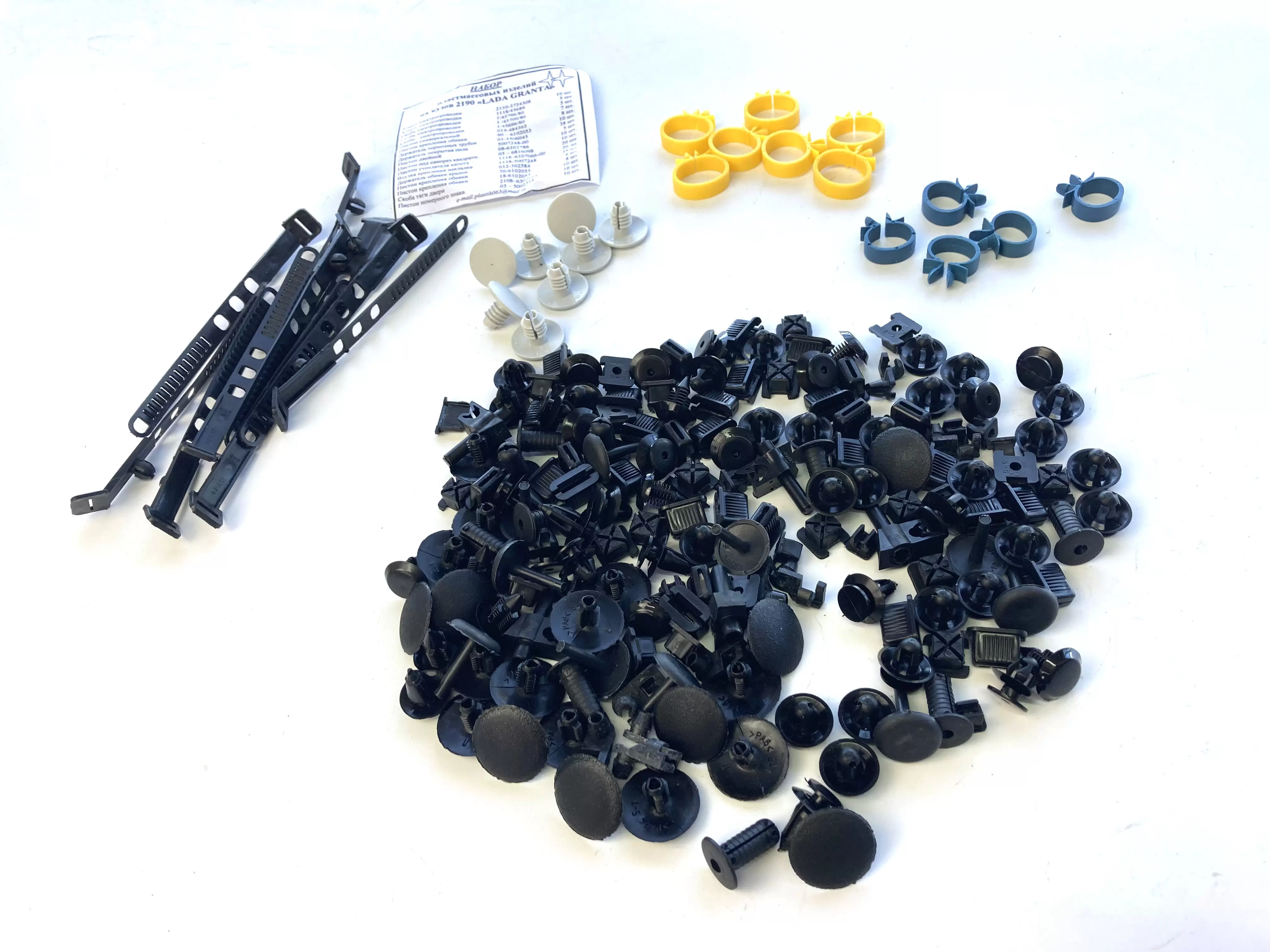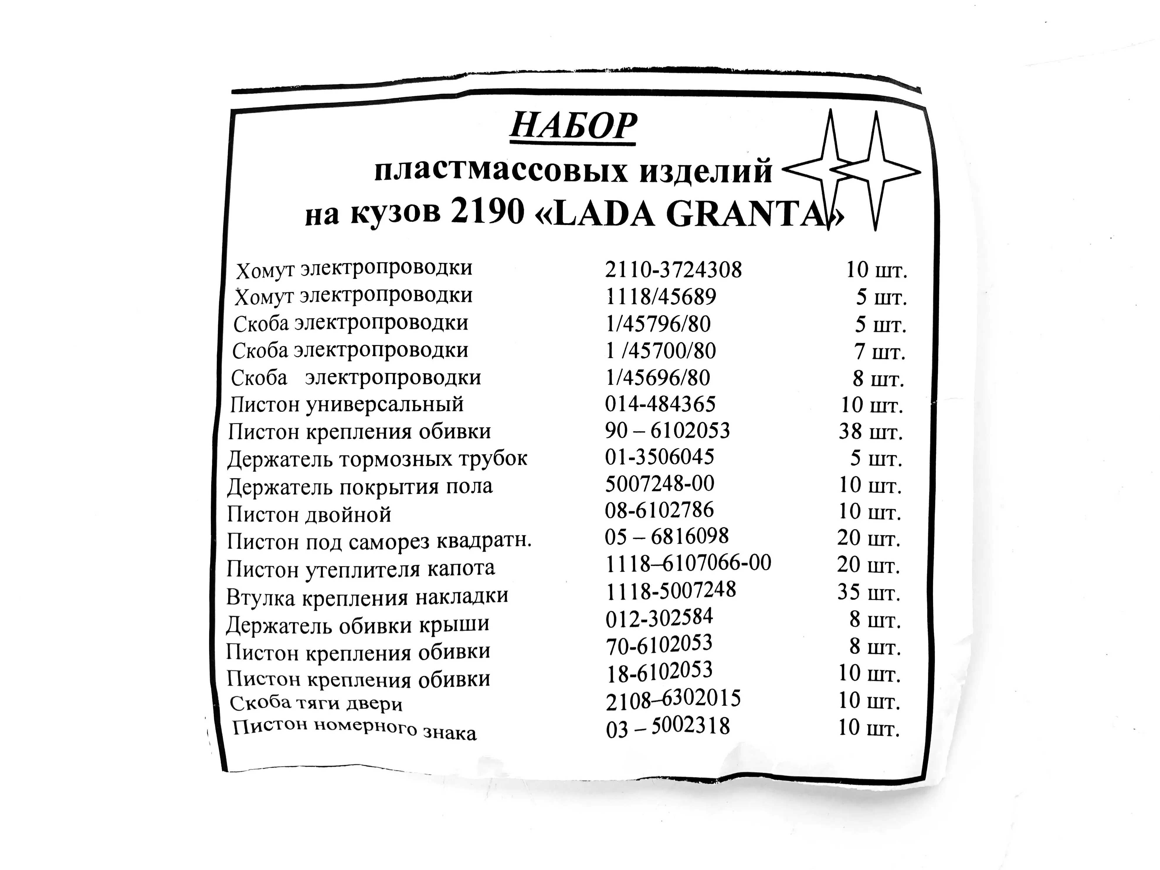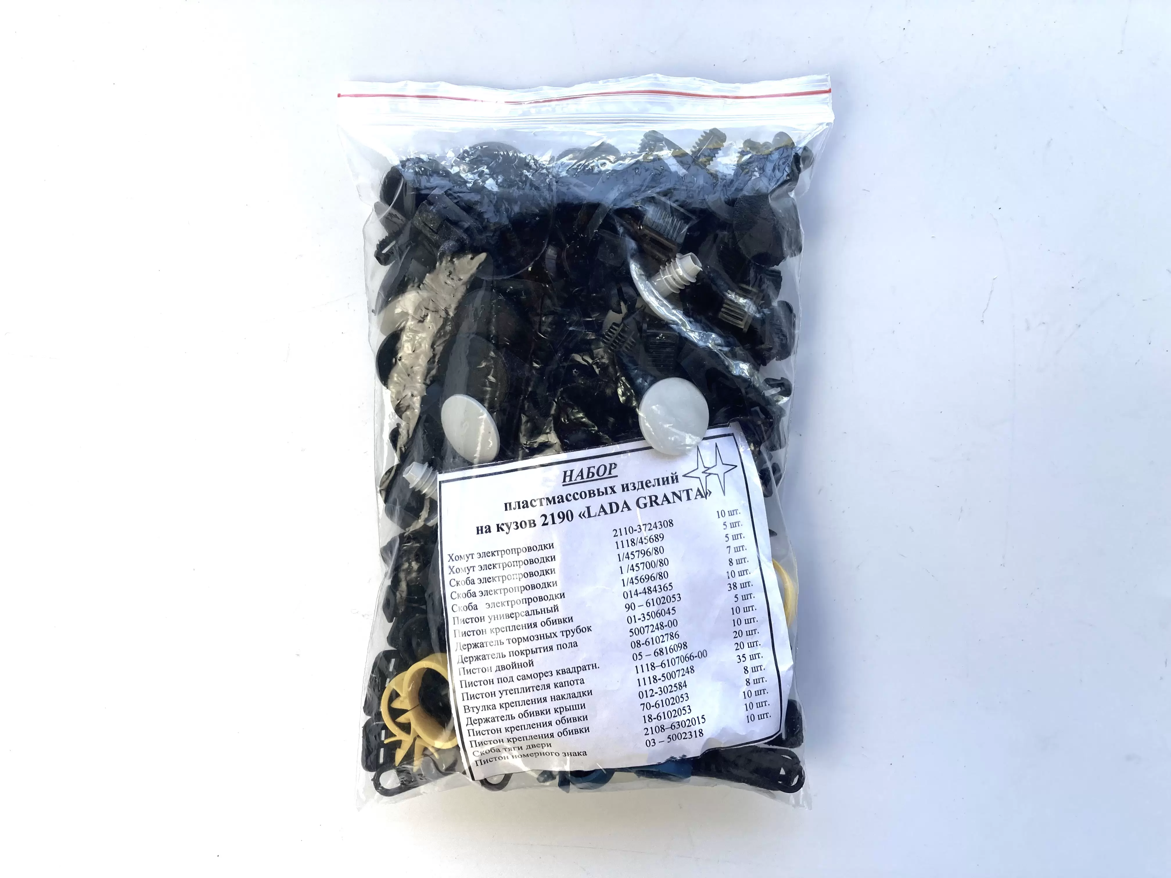 Набор кузовных пистонов предназначен для крепления элементов кузова и салонной обшивки автомобилей LADA Granta (ВАЗ 2190). Используется при ремонте, обслуживании и замене штатного крепежа после демонтажа пластиковых панелей и облицовок.
