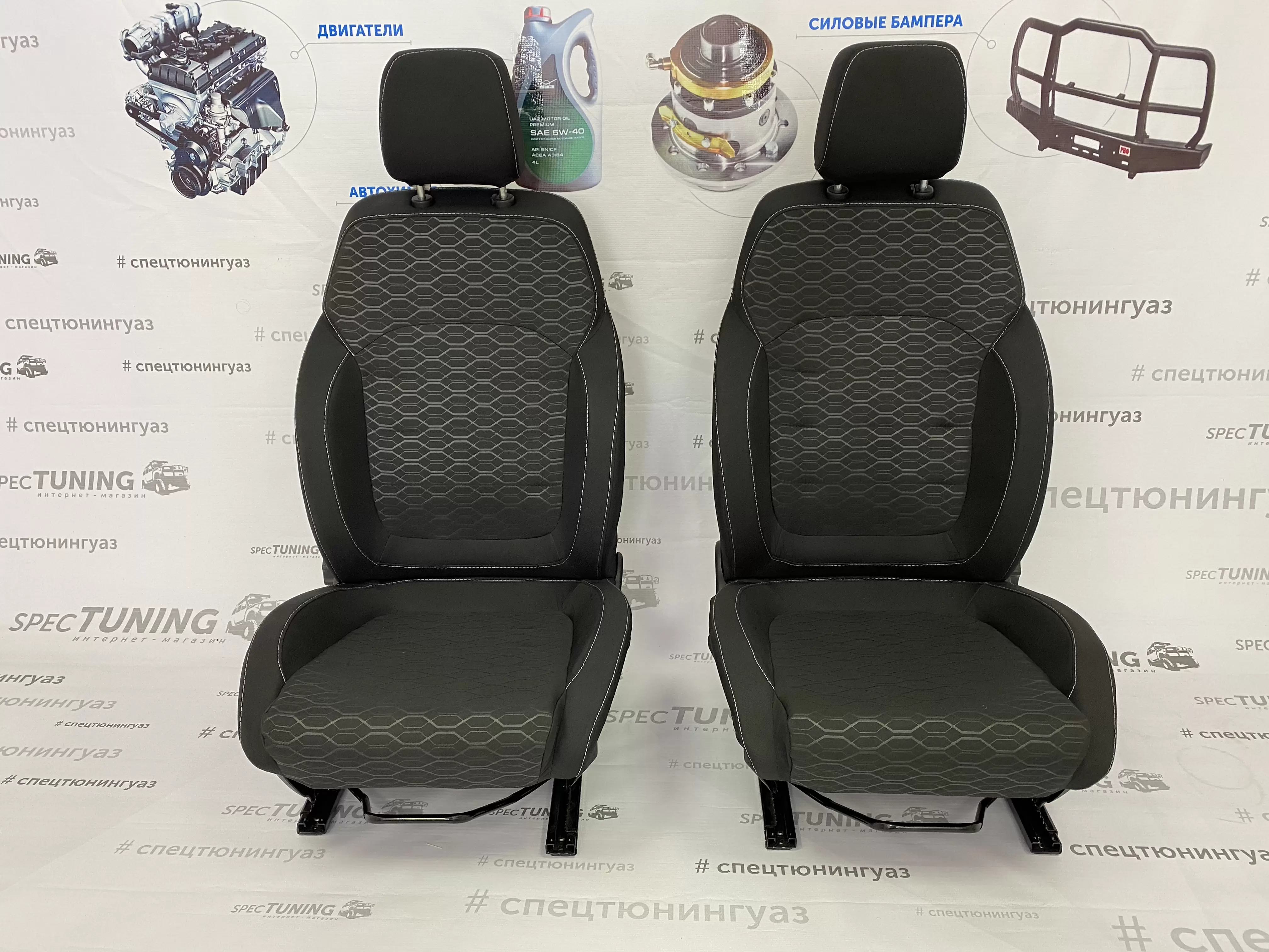Комплект передних сидений нового образца для автомобилей УАЗ Патриот и их модификаций, выпускаемых с 2018 года. Сиденья имеют обновлённую форму, улучшенную эргономику и выраженную боковую и поясничную поддержку, характерную именно для данной версии.