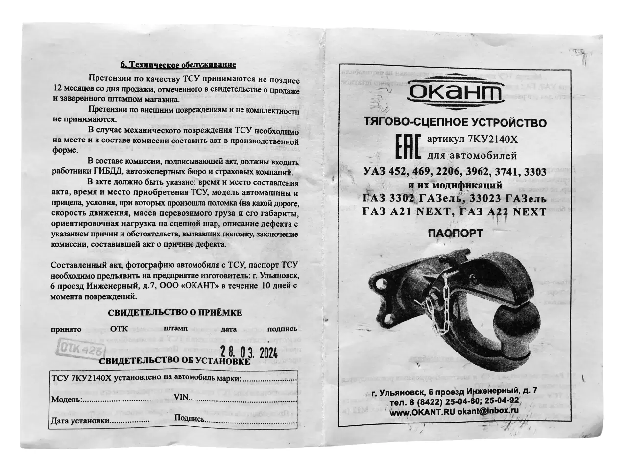 - Паспорт – 1 шт.